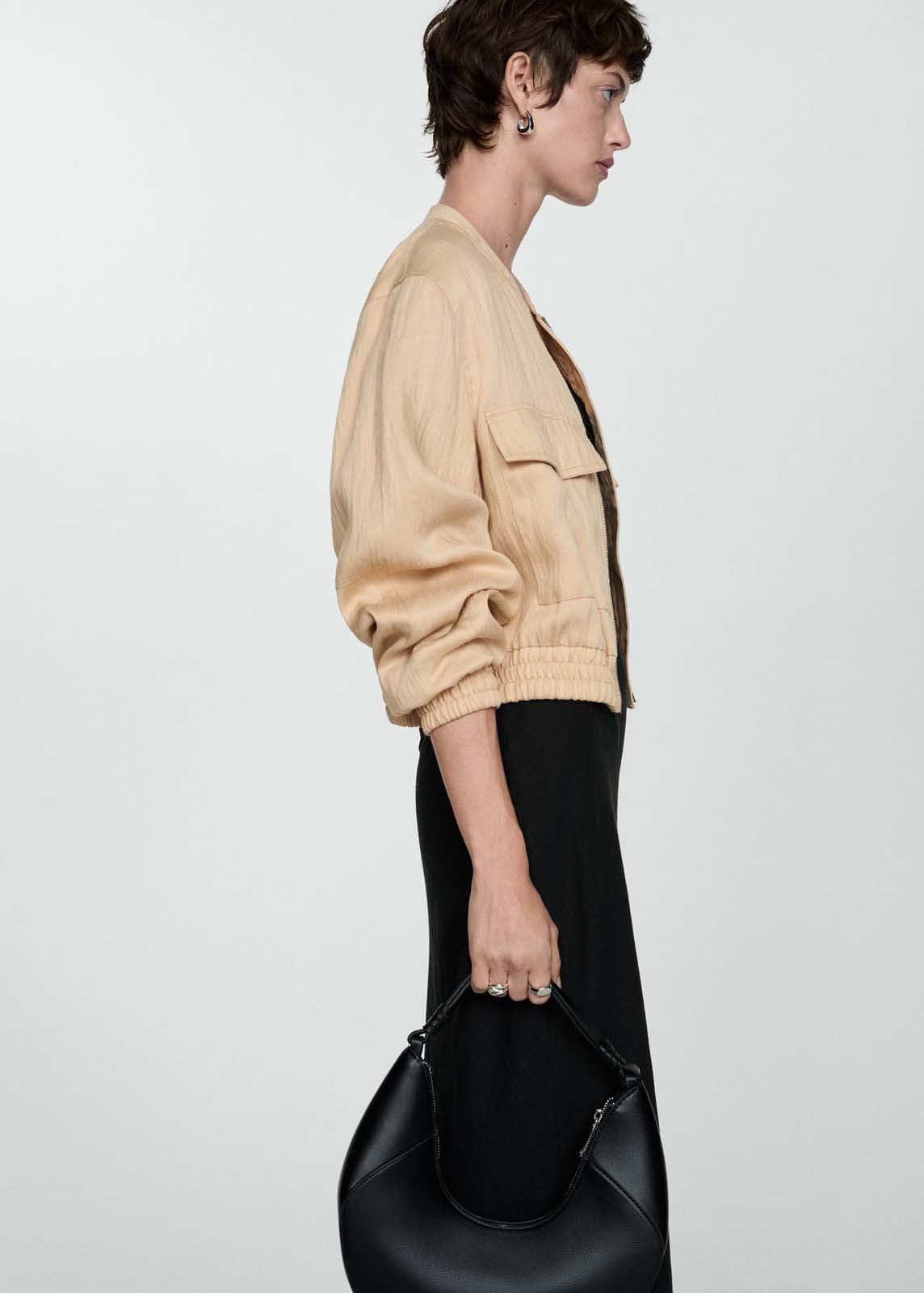 Tejido fluido,Elástico en el bajo,Manga larga con puños elásticos,Cierre delantero con cremallera,Cuello redondo,Dos bolsillos de solapa en la parte delantera,Diseño bomber