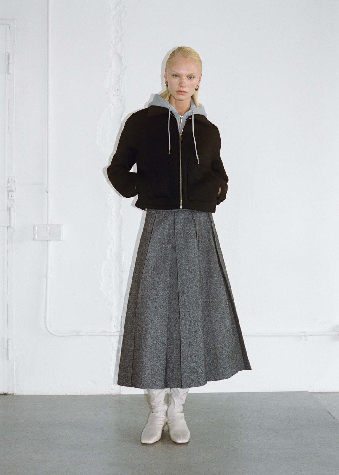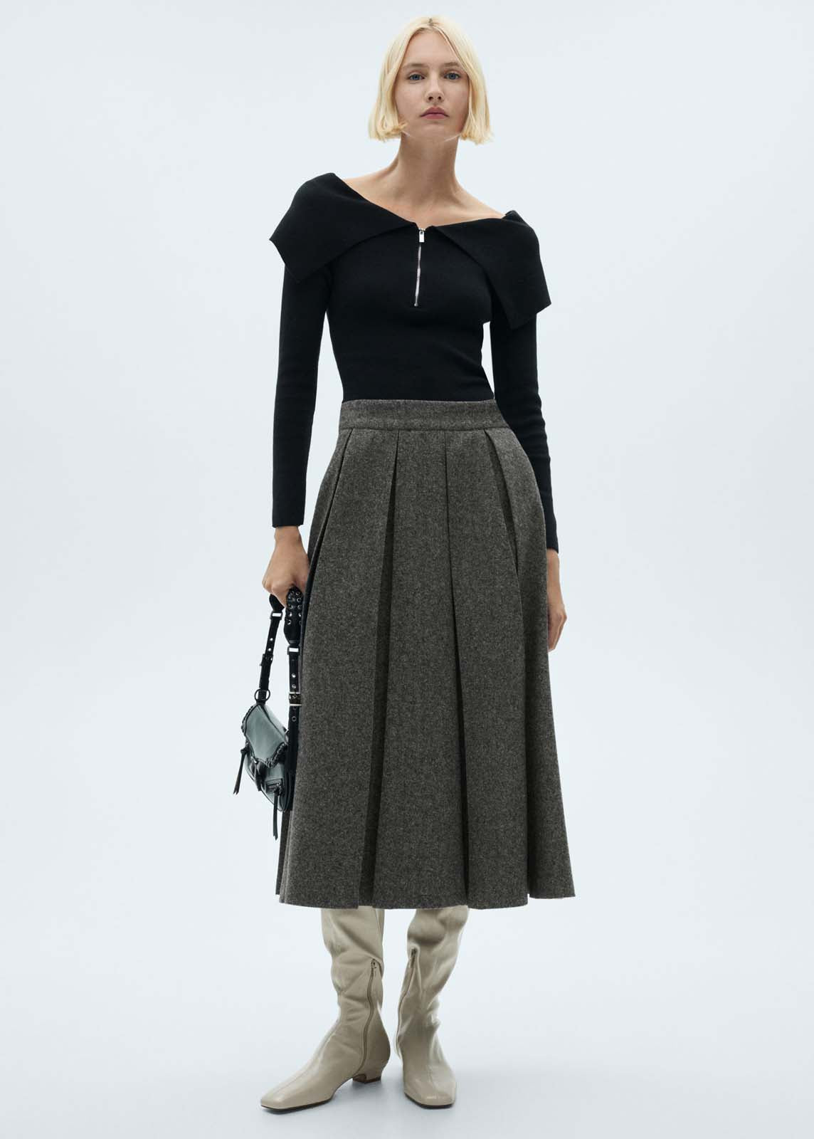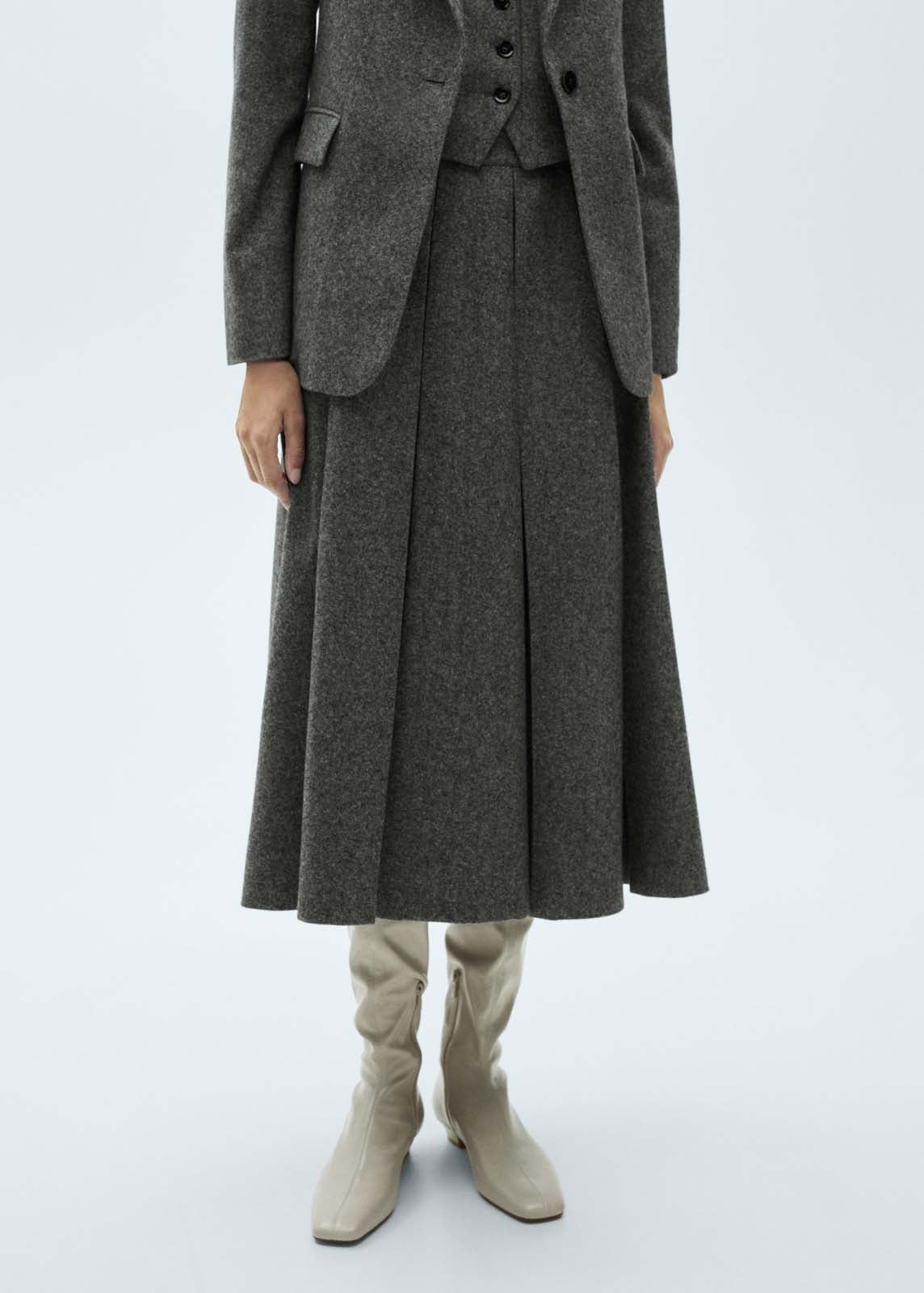 Tejido mezcla de lana,Tiro medio,Diseño de tablas,Diseño evasé,Cierre de cremallera invisible en la parte posterior,Tejido jaspeado,Diseño midi,La modelo mide 1,79 y lleva una talla S/36