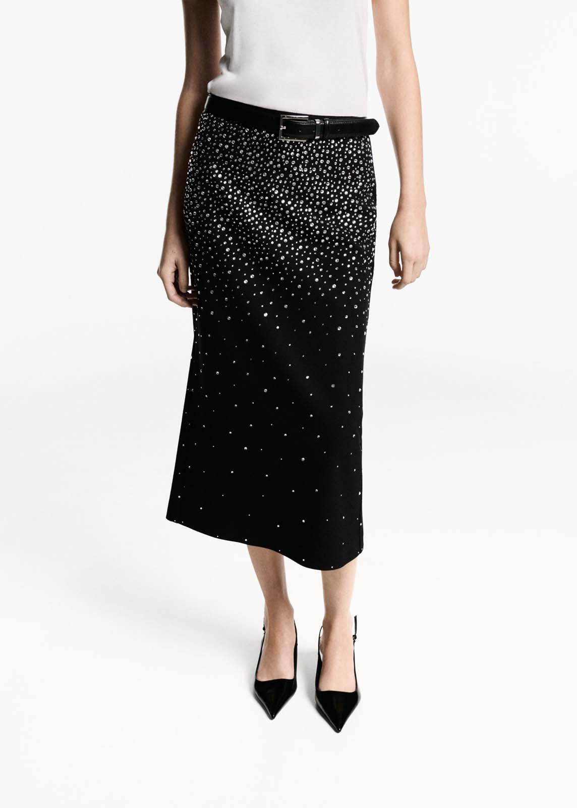 Colección fiesta y ceremonia,Cintura con goma elástica,Tiro medio,Sin cierre,Detalle de strass,Diseño recto,Diseño midi,La modelo mide 1,77 y lleva una talla S/36,La modelo mide 1,81 y lleva una talla S/36