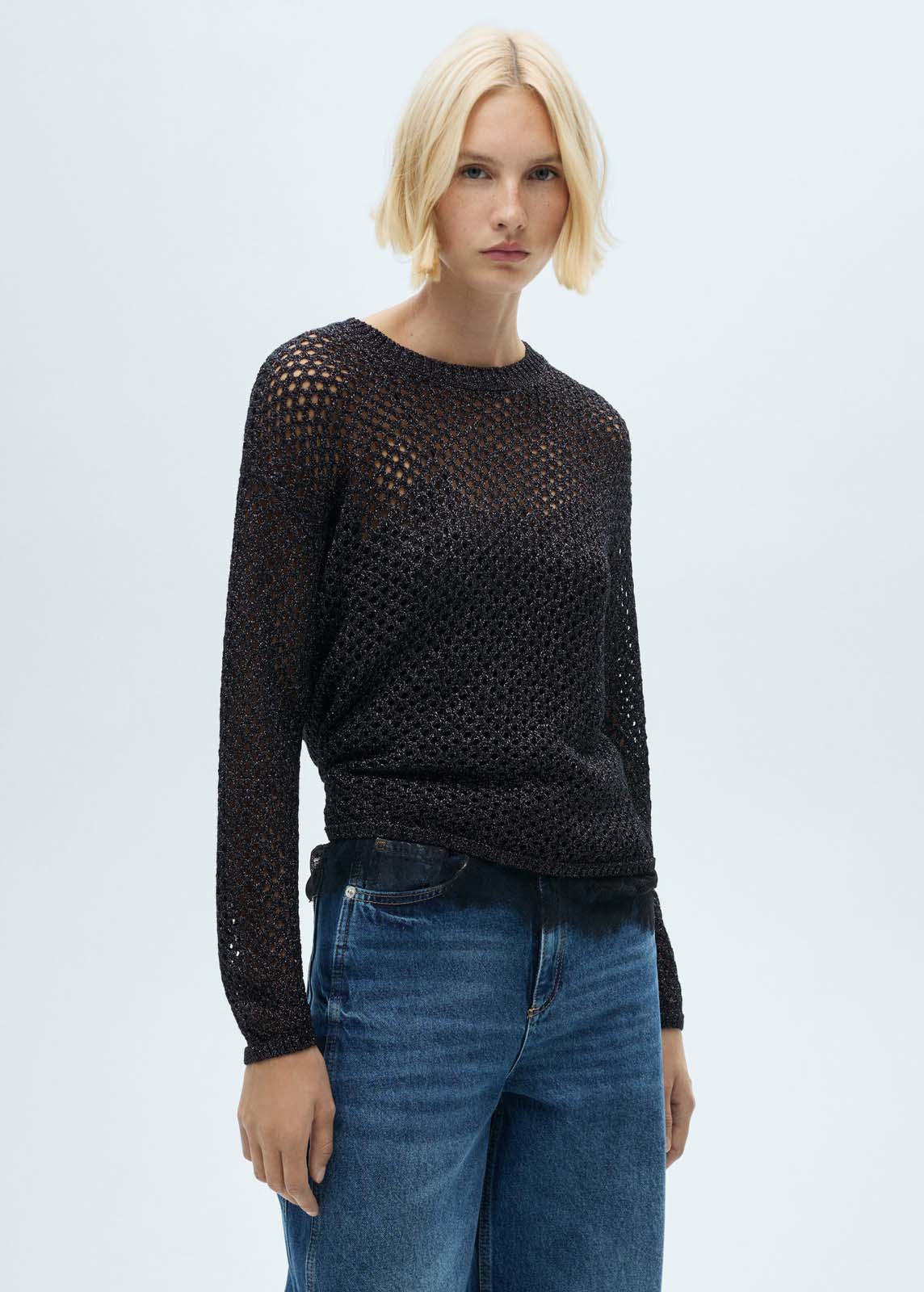 Colección fiesta y ceremonia,Tejido de punto calado,Tejido de lúrex,Cuello redondo,Diseño recto,La modelo mide 1,78 y lleva una talla S/36,Manga larga,Punto medio
