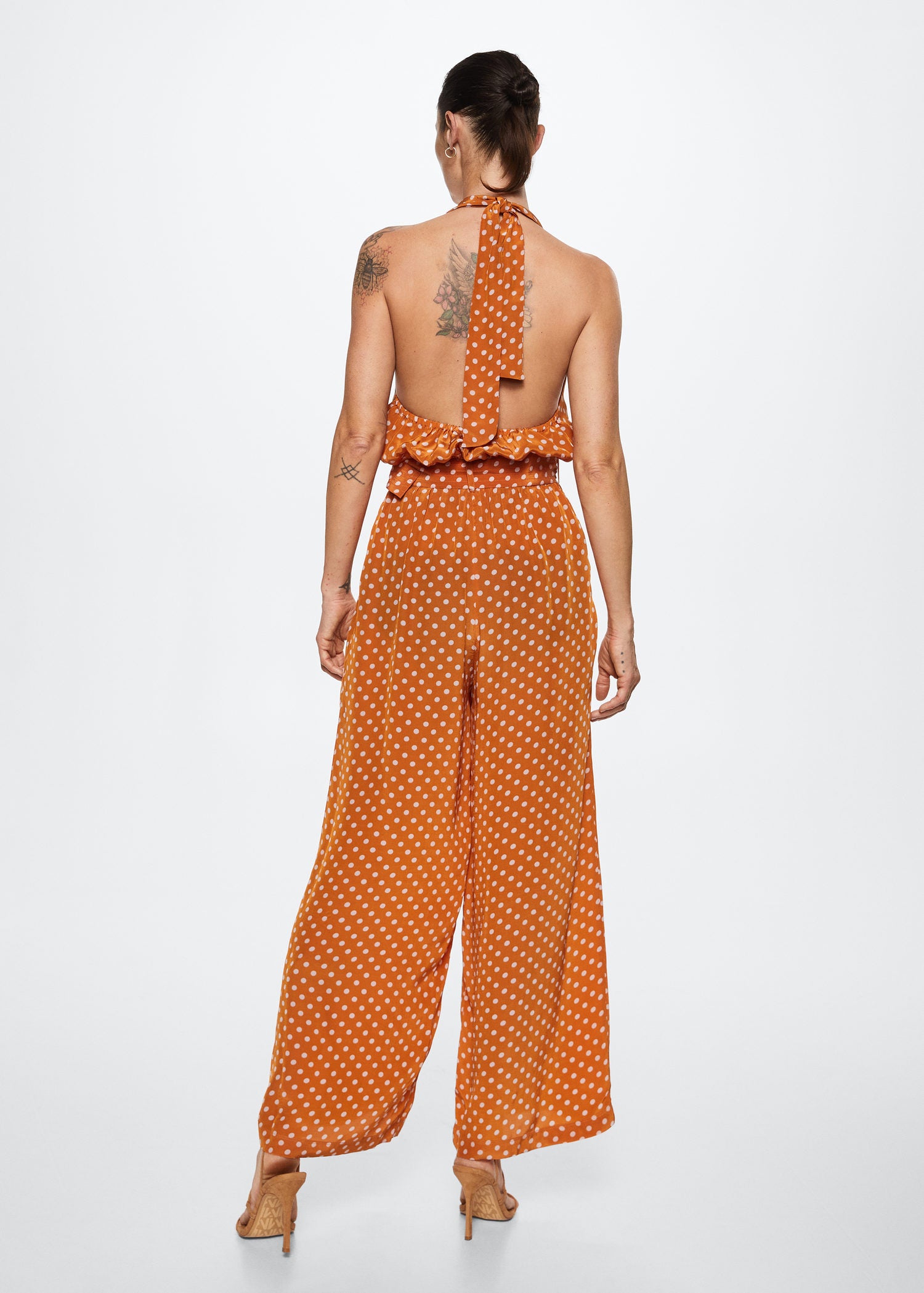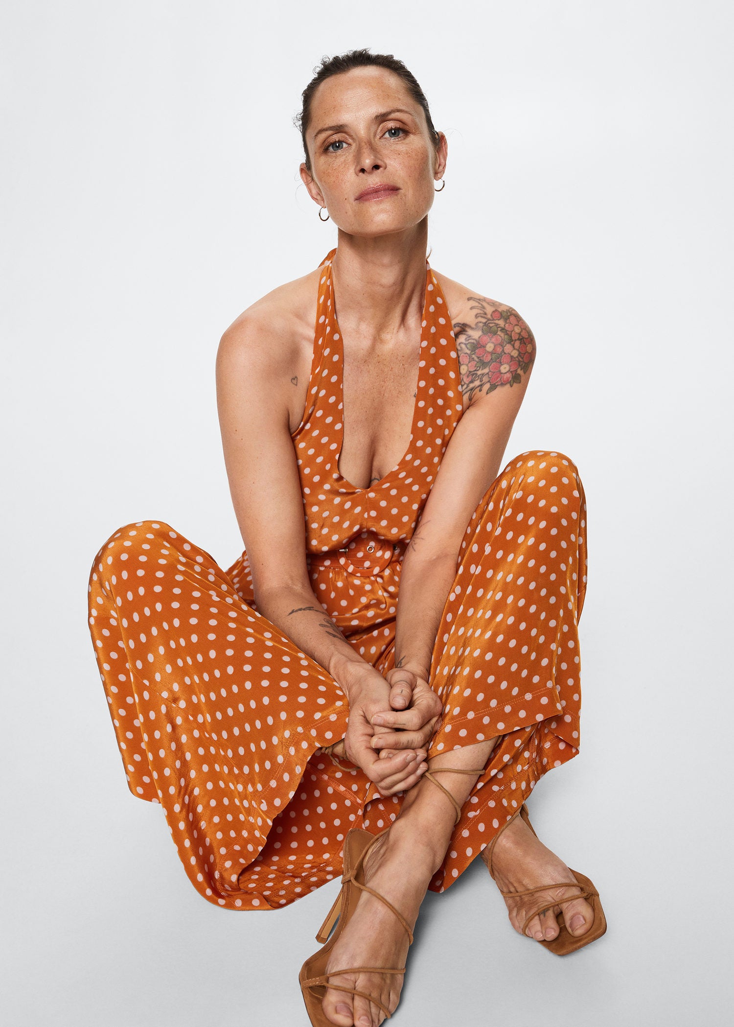 Tejido fluido. Estampado de lunares. Diseño largo. Diseño recto. Cuello halter. Cinturón decorativo. Trabillas. Espalda abierta. Colección fiesta y ceremonia.