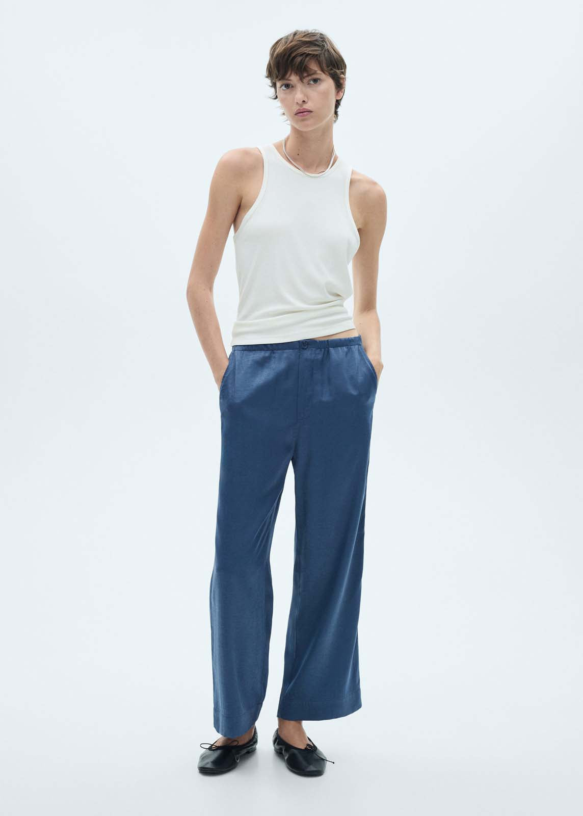 Cierre de cremallera y botón,Tejido fluido,Diseño crop,Tejido satinado,Total look,Diseño recto,La modelo mide 1,74 y lleva una talla S/36,Tiro alto