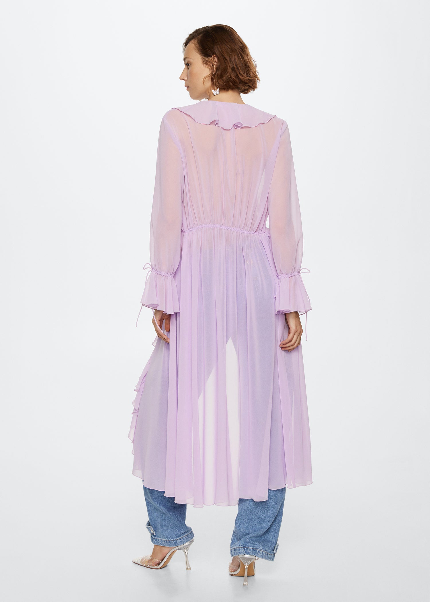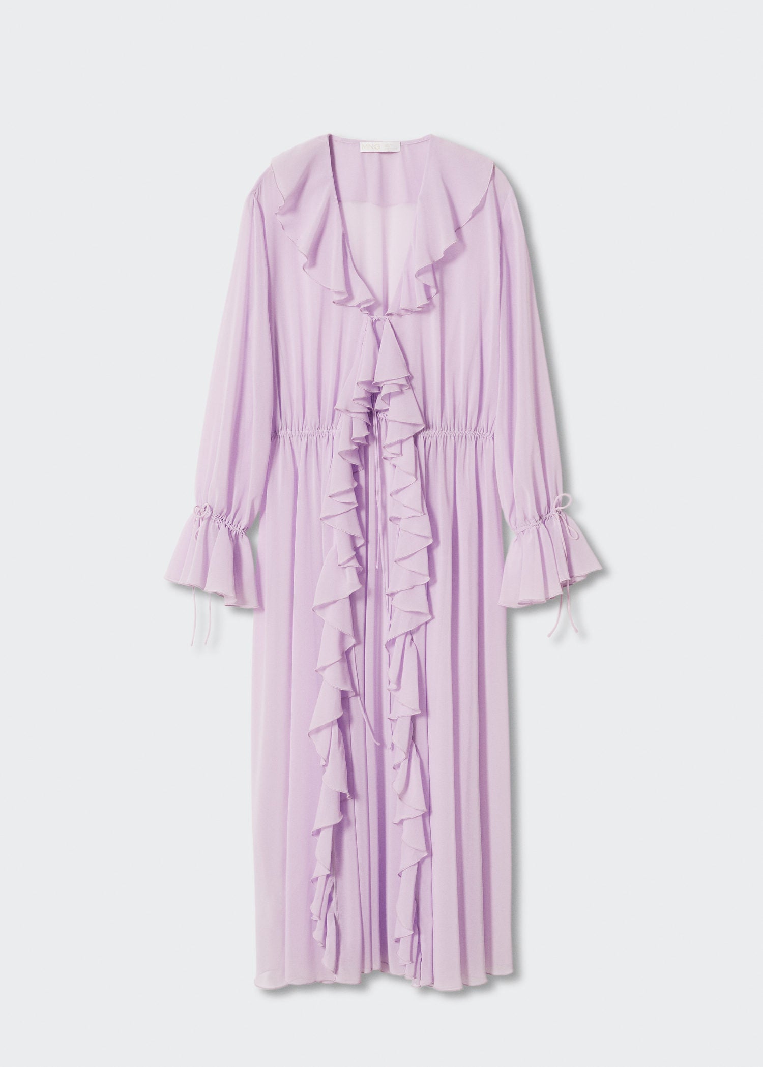 Tejido fluido. Tejido semitransparente. Diseño largo. Diseño evasé. Cuello pico. Manga larga con volante. Volantes decorativos. Fruncido elástico en la cintura. Detalles elásticos en las mangas. Sin forro interior. Cierre de lazo. Colección fiesta y ceremonia.