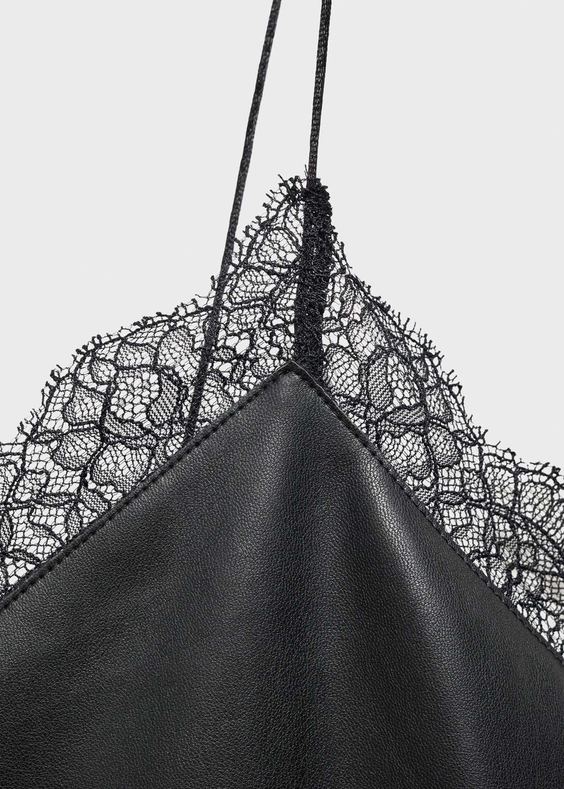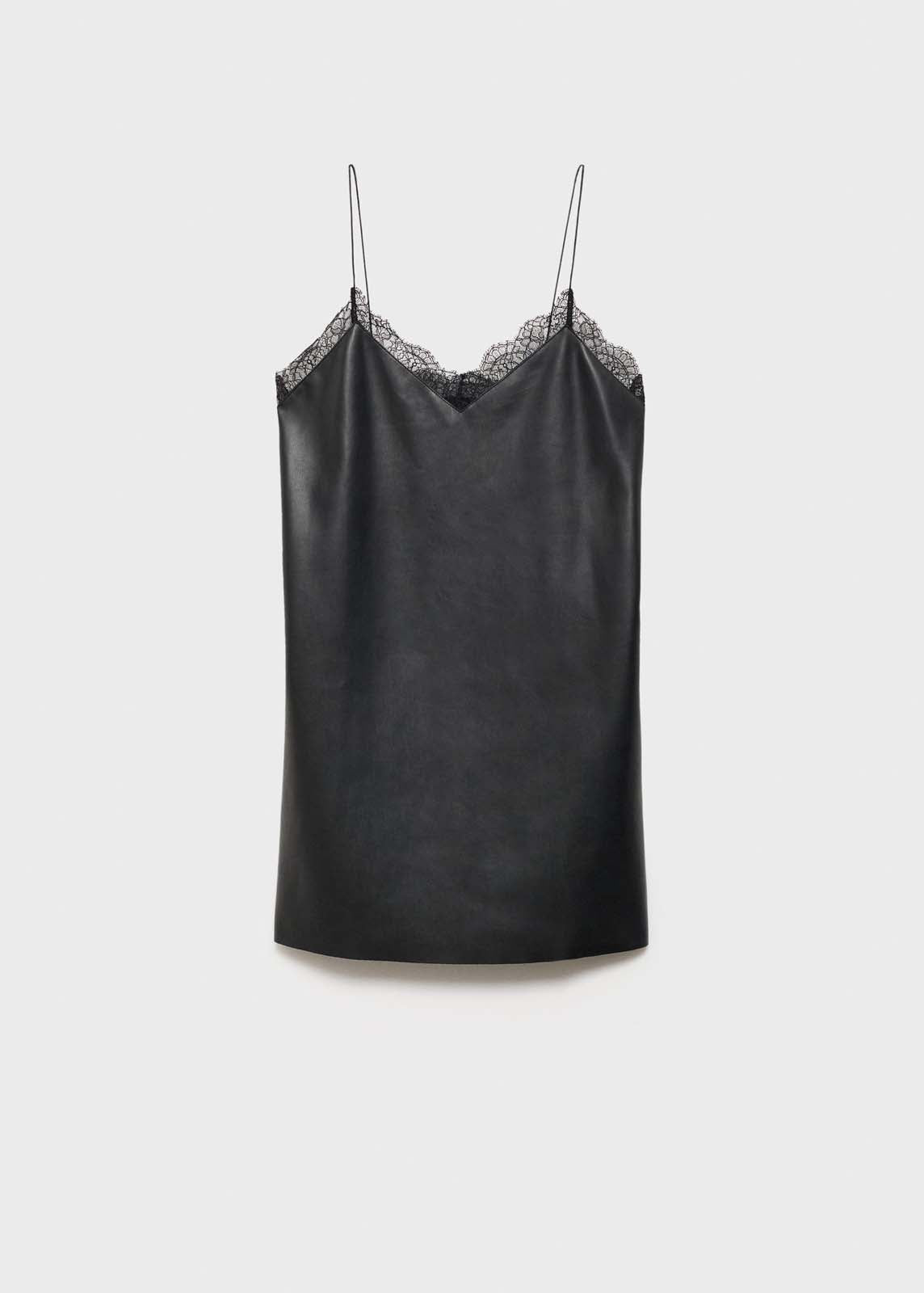 Efecto piel,Colección fiesta y ceremonia,Tirantes finos,Cuello pico,Sin cierre,Detalle encaje,Diseño corto,Diseño recto,Estilo lencero,Tamaño mediano,La modelo mide 1,79 y lleva una talla S/36