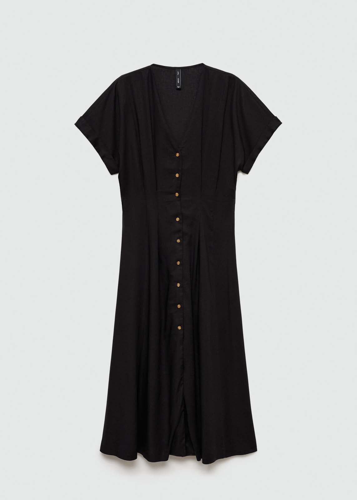 Manga corta,Tejido fluido,Tejido mezcla de lino,Cuello pico,Cierre de botones en la parte delantera,Diseño evasé,Diseño largo