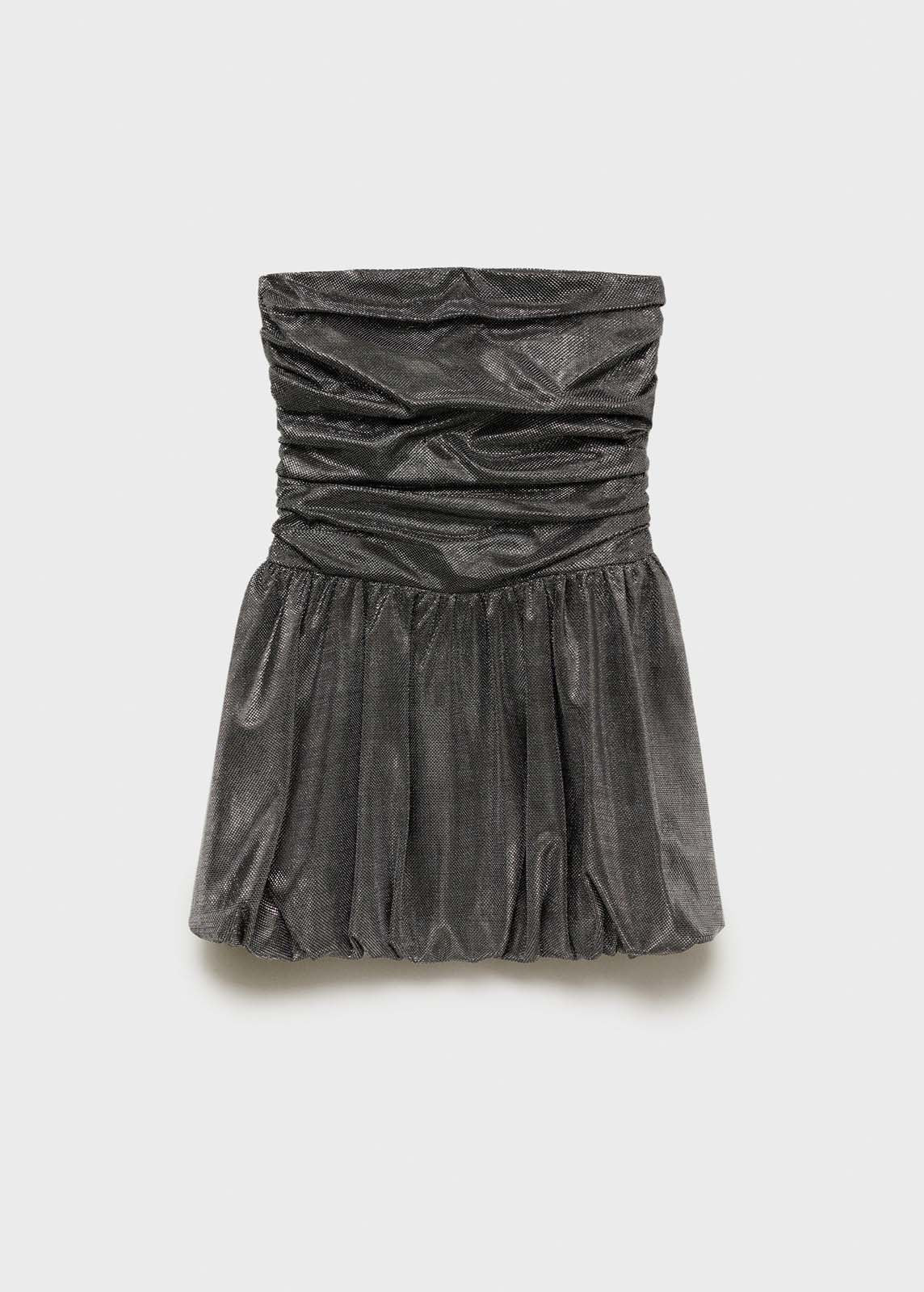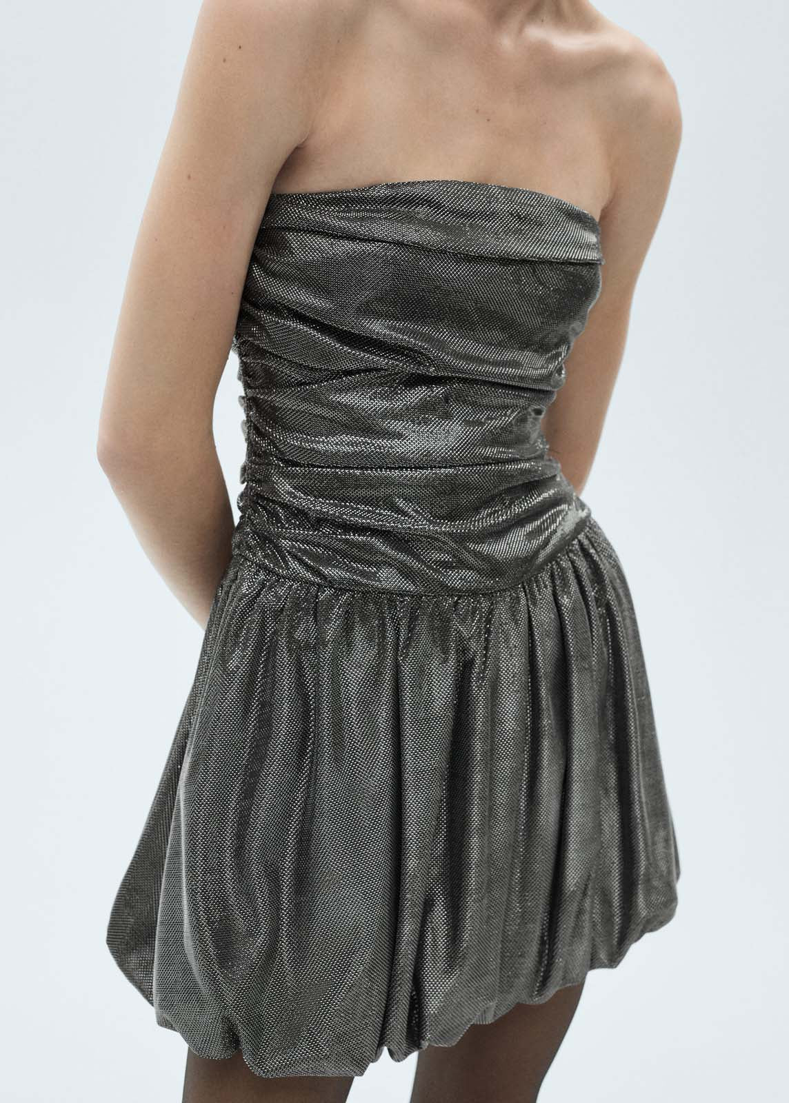 Forro interior,Colección fiesta y ceremonia,Tejido con brillos,Diseño corto,Palabra de honor,Cierre de cremallera en la parte posterior,Sin mangas,Diseño drapeado,Diseño entallado,La modelo mide 1,77 y lleva una talla S/36,Estilo globo,La modelo mide 1,78 y lleva una talla S/36