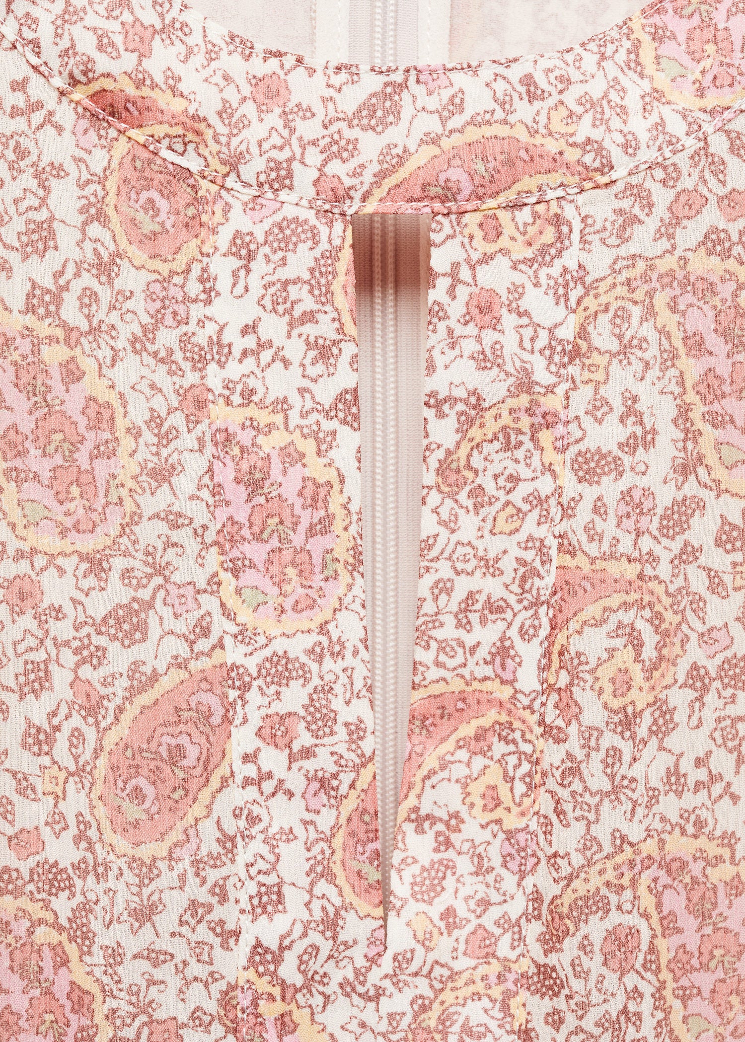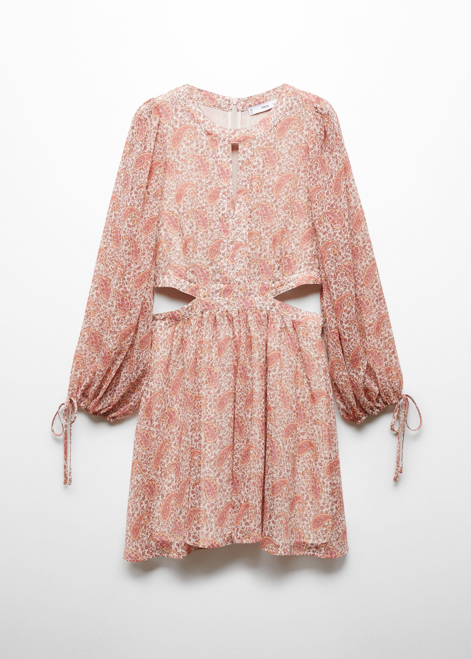 Aberturas laterales,Diseño recto,Tejido fluido,Estampado paisley,Cierre de cremallera en la parte posterior,Detalle de abertura,Manga larga abullonada,Diseño corto,Detalle de lazos en los puños,Cuello redondo