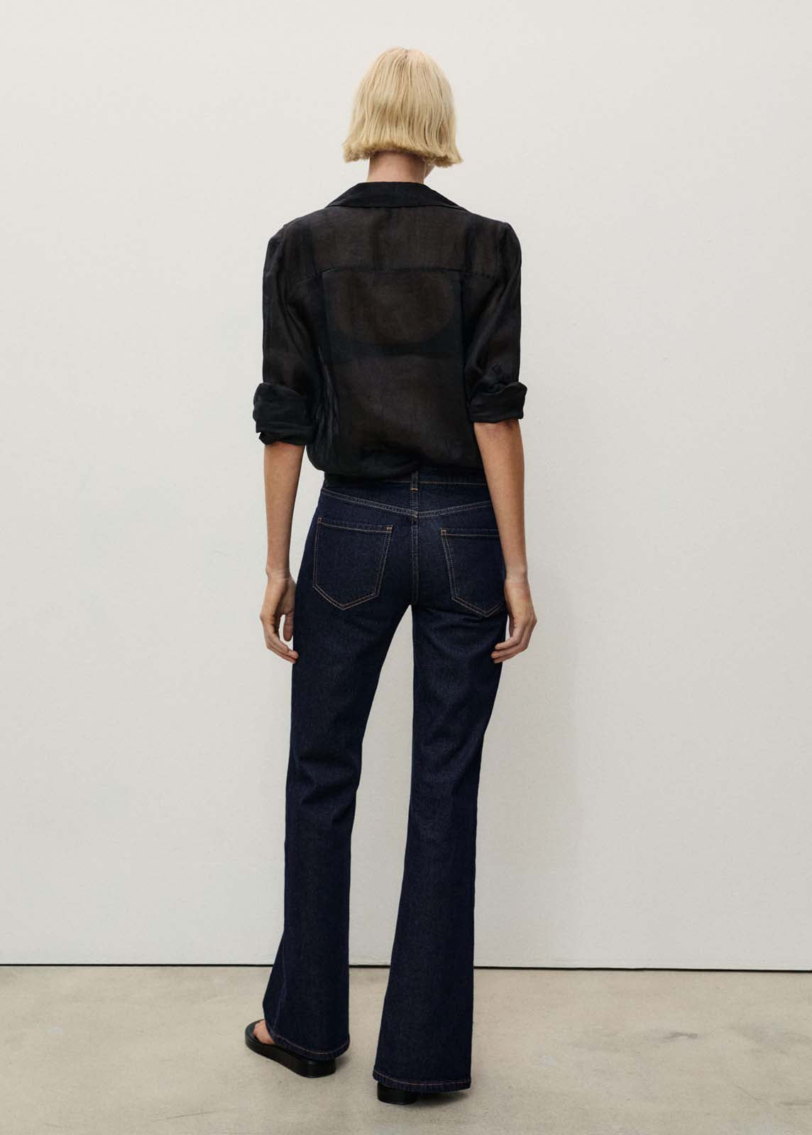 Trabillas,Tiro medio,Cierre delantero de cremallera y botón,Cinco bolsillos,Aberturas en el bajo,Tejido elástico,Estilo flare,Tejido de algodón estilo tejano vaquero,Largo interior 85 cm,Diseño largo,Rinse wash