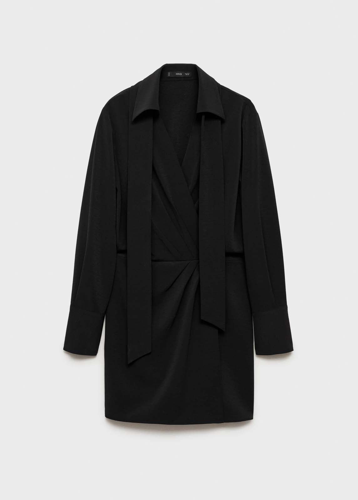 Cuello pico con solapa,Pliegues en la cintura,Lazo desmontable en el cuello,Escote cruzado,Sin cierre,Diseño corto,Manga larga con puños abotonados,Diseño recto