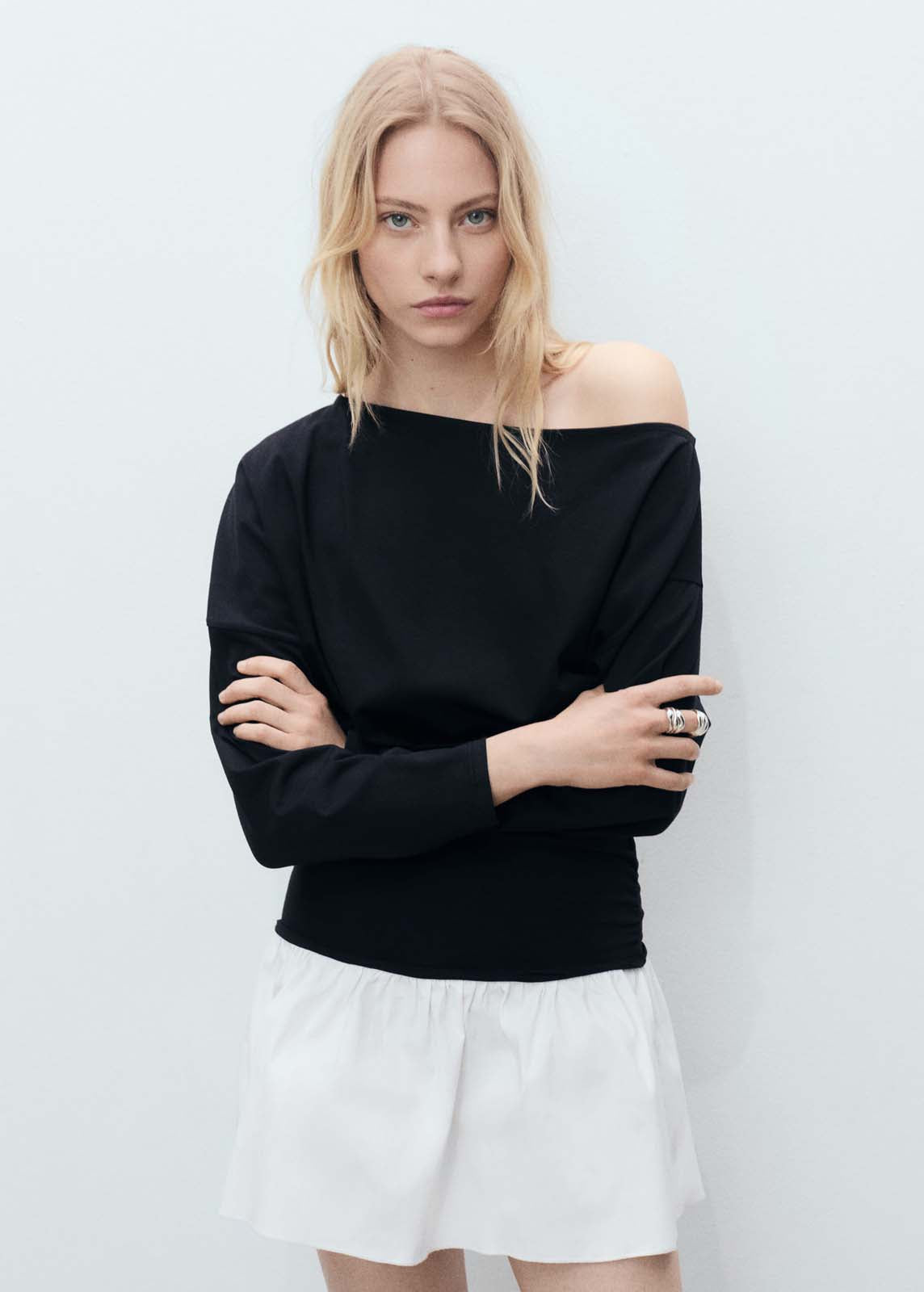Diseño corto,Cuello asimétrico,Bajo con volante,Diseño combinado,Tejido de algodón,Diseño entallado,Manga larga,Cintura drapeada
