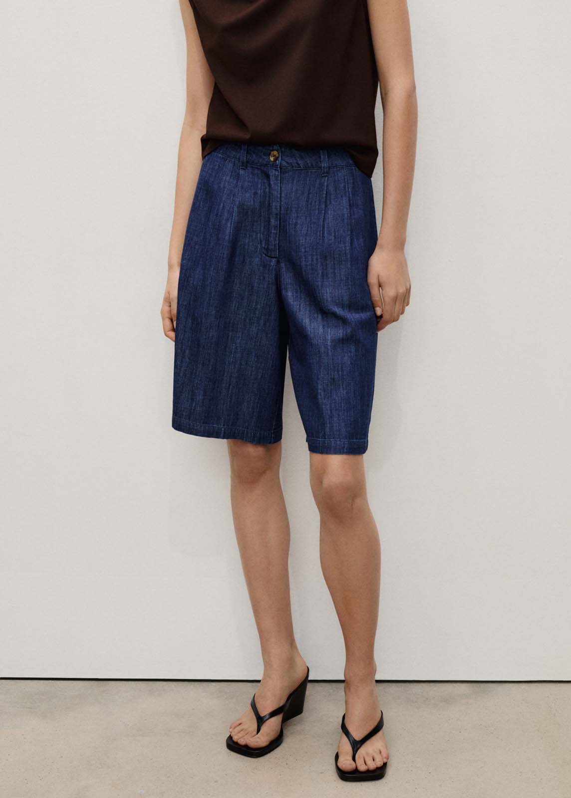 Trabillas,Tiro medio,Cierre delantero de cremallera y botón,Detalle de pinzas,Diseño corto,Dos bolsillos laterales,Total look,Soft denim,Diseño recto,Tejido de algodón estilo tejano vaquero