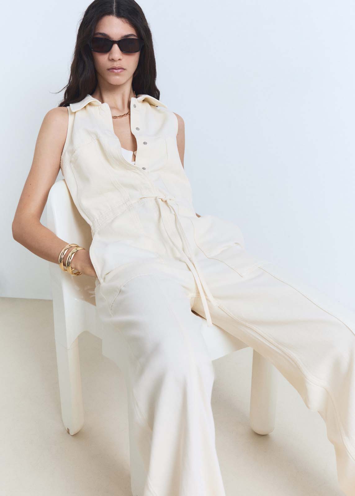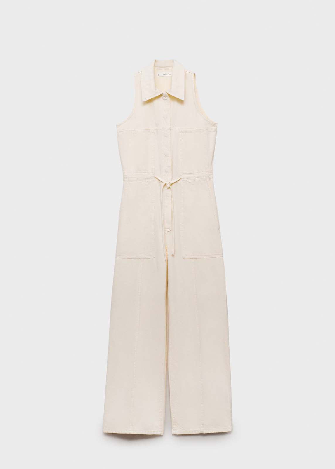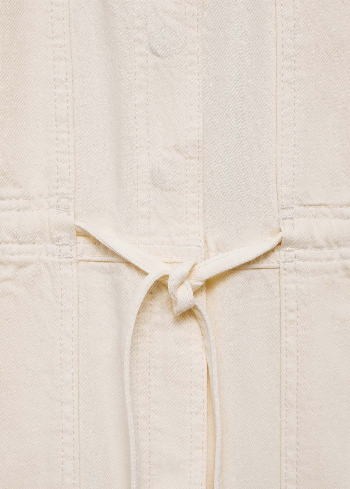 Cuatro bolsillos en la parte delantera,Dos bolsillos en la parte posterior,Tirantes anchos,Cinta en la cintura con cierre de lazo,Diseño recto,Cuello camisero,Diseño largo,Sin mangas,Tejido de algodón,Cierre delantero con botones