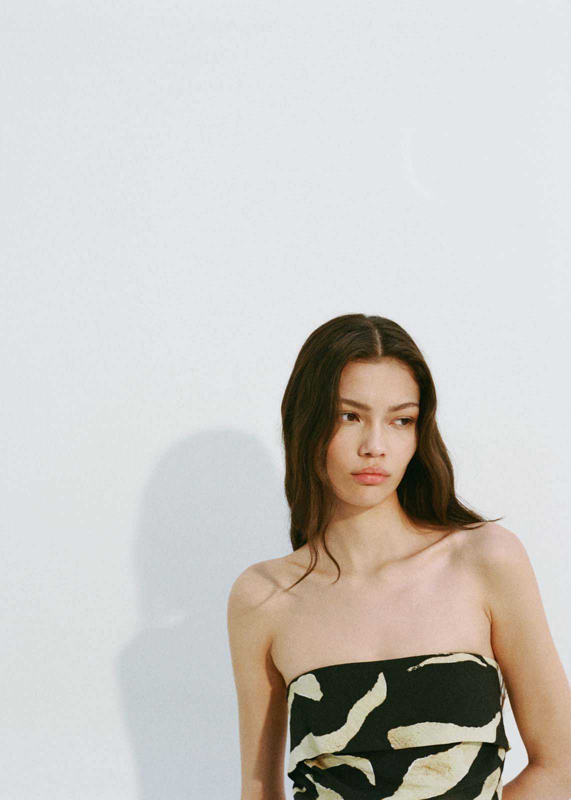 Tirantes para mayor sujeción a partir de la talla 1XL,Panel fruncido elástico en la parte posterior,Palabra de honor,Disponible Plus,Diseño recto,Cierre de cremallera en la parte posterior,Diseño largo,Sin mangas,Estampado abstracto,Escote vuelto