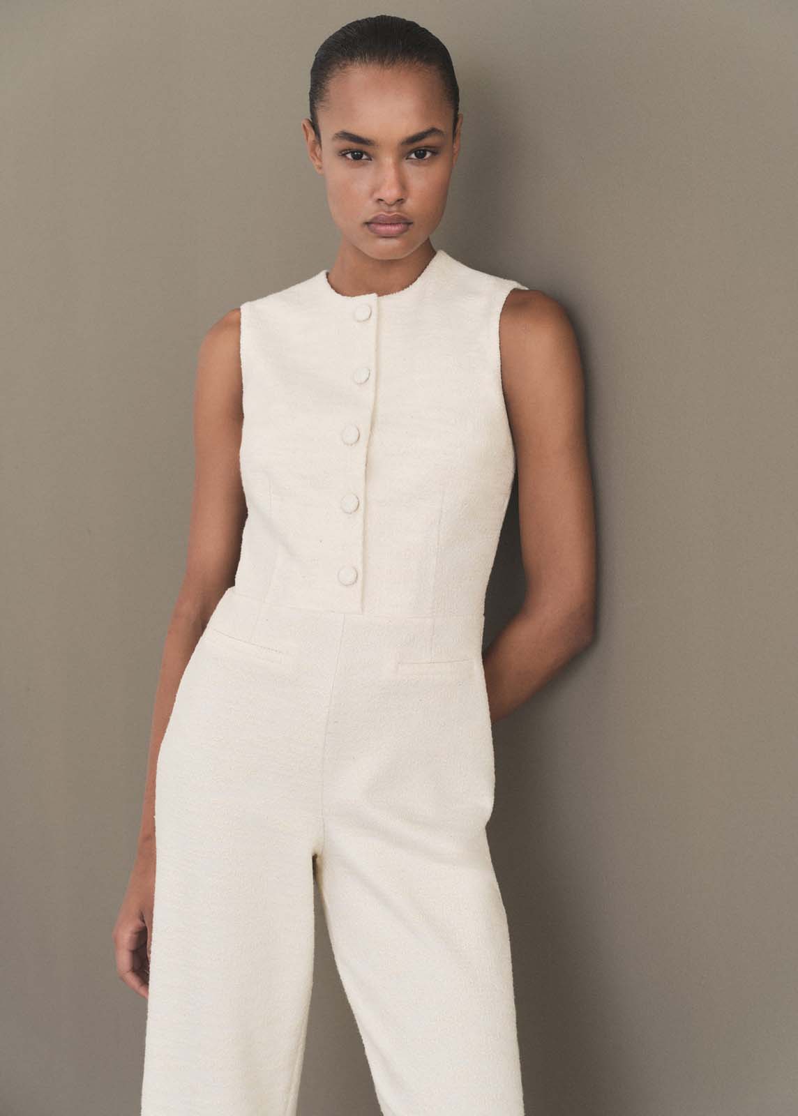 Dos bolsillos de ribete delanteros,Cierre de botones en la parte delantera,Cuello redondo,Tejido tweed,Diseño recto,Diseño largo,Sin mangas
