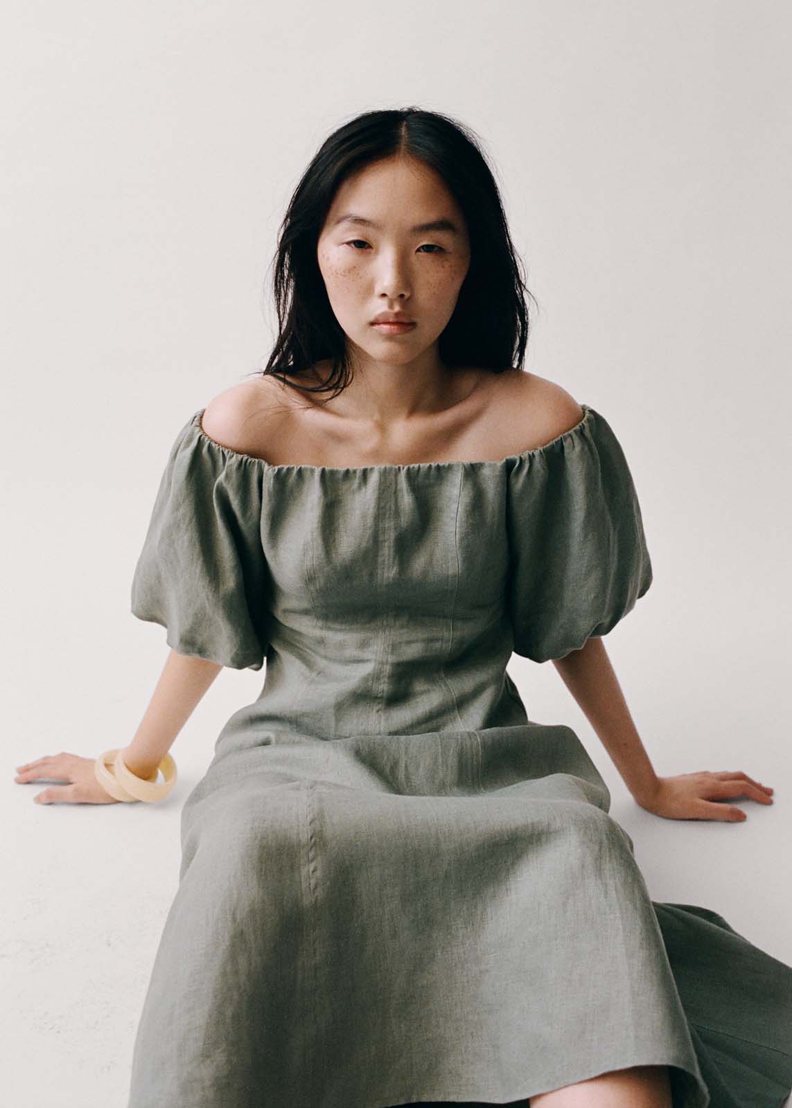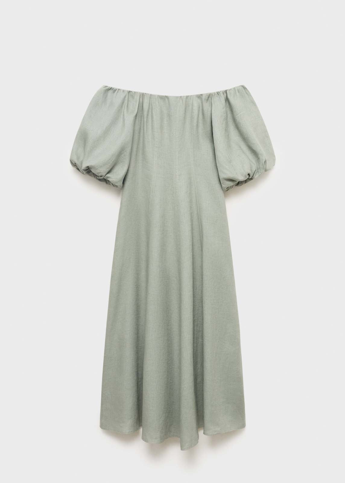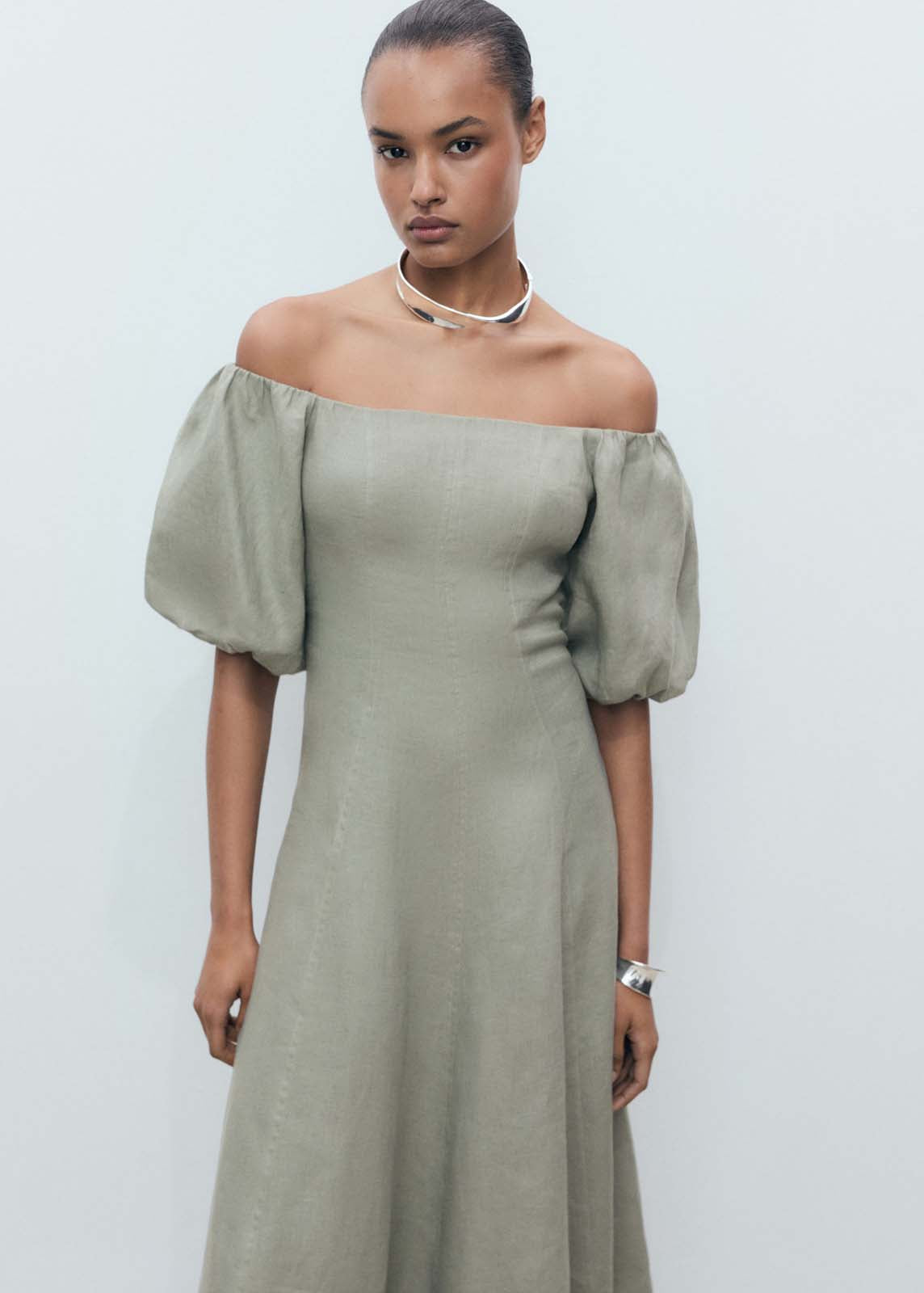 Manga corta abullonada,Tejido 100% de lino,Diseño evasé,Palabra de honor,Cierre de cremallera en la parte posterior,Diseño midi,Forro interior
