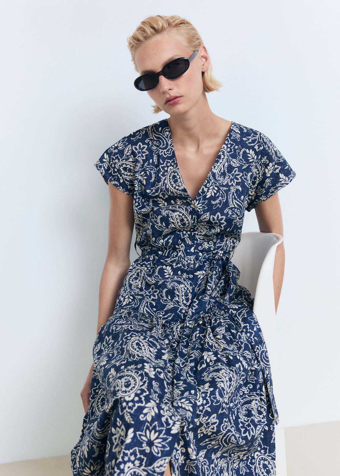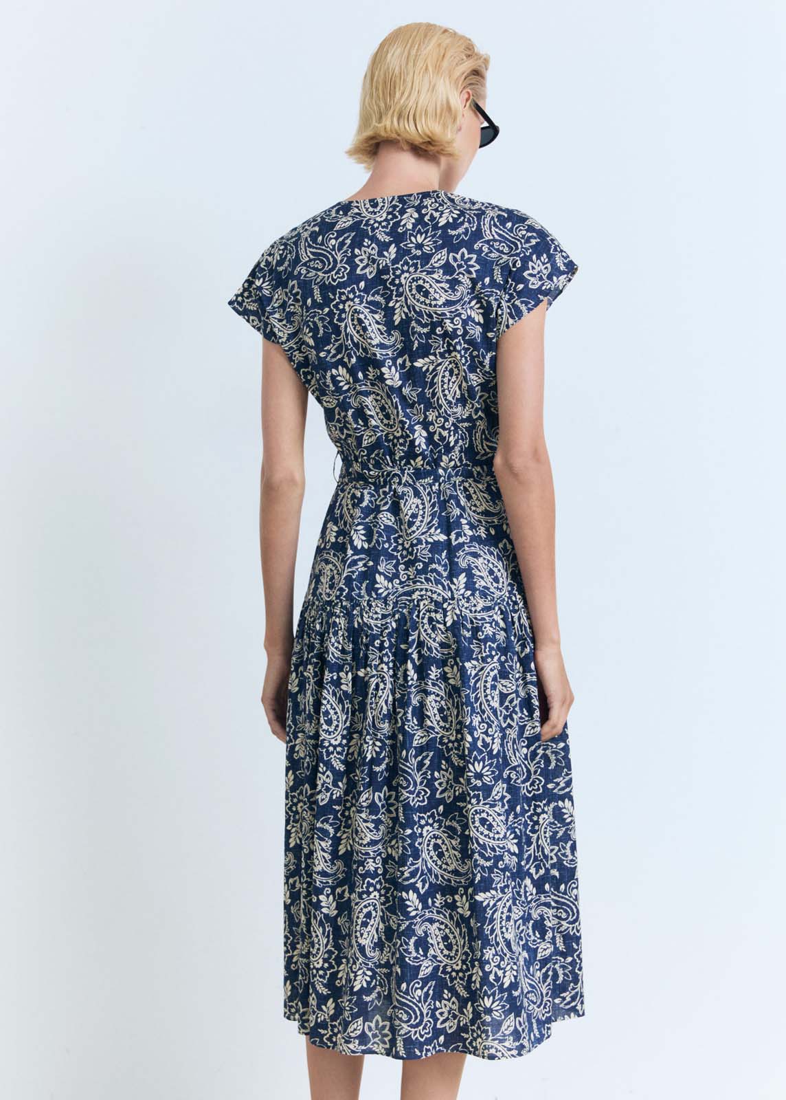 Manga corta,Trabillas,Diseño evasé,Disponible Plus,Cuello de pico,Cinturón desmontable,Diseño midi,Estampado Paisley,Tejido de algodón,Cierre delantero con botones