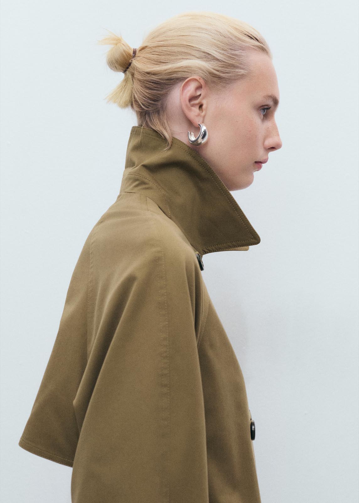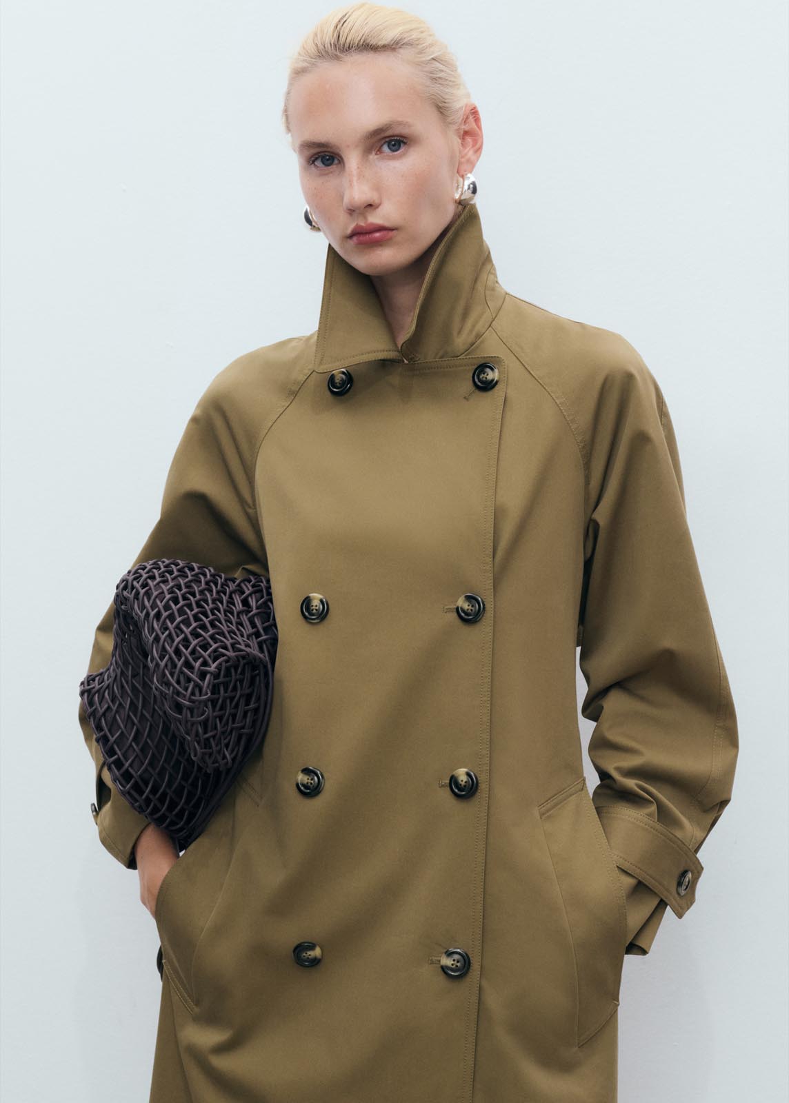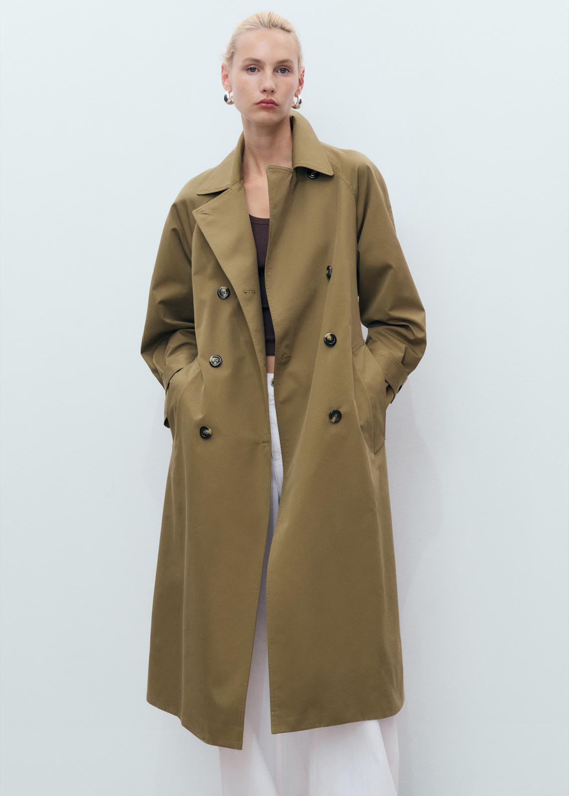 Cierre de doble botonadura,Cuello de solapa ancha,Dos bolsillos laterales,Manga larga abotonada,Diseño recto,Cinturón desmontable,Diseño oversize,Diseño largo,Tejido de algodón,Forro interior