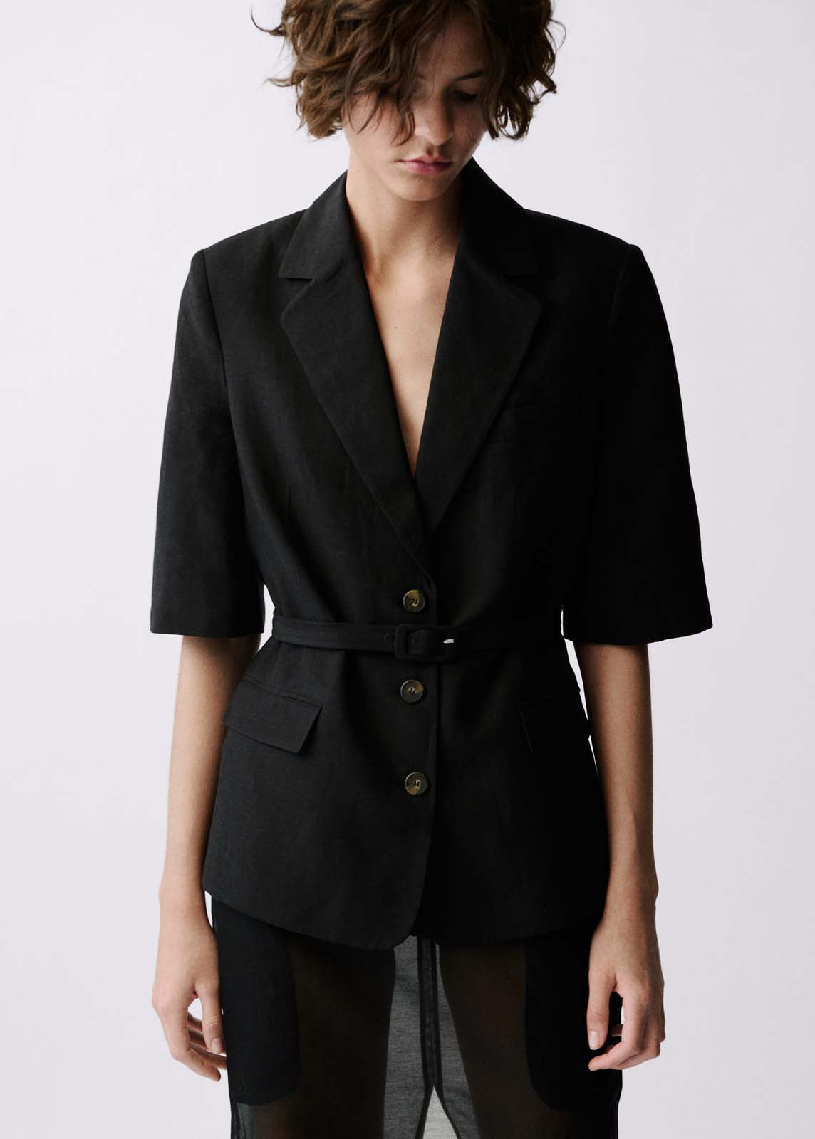 Cuello pico con solapa,Trabillas,Tejido mezcla de lino,Manga tres cuartos,Cinturón con cierre de hebilla,Solapas con muesca,Dos bolsillos de solapa laterales,Total look,Diseño recto,Estilo traje,Cierre delantero con botones