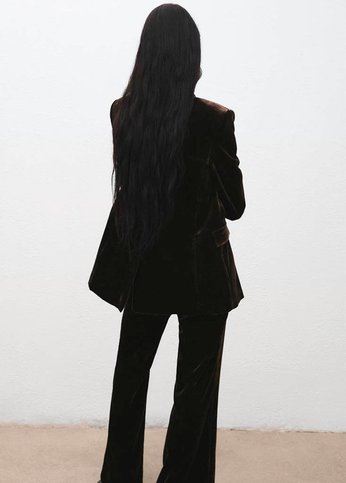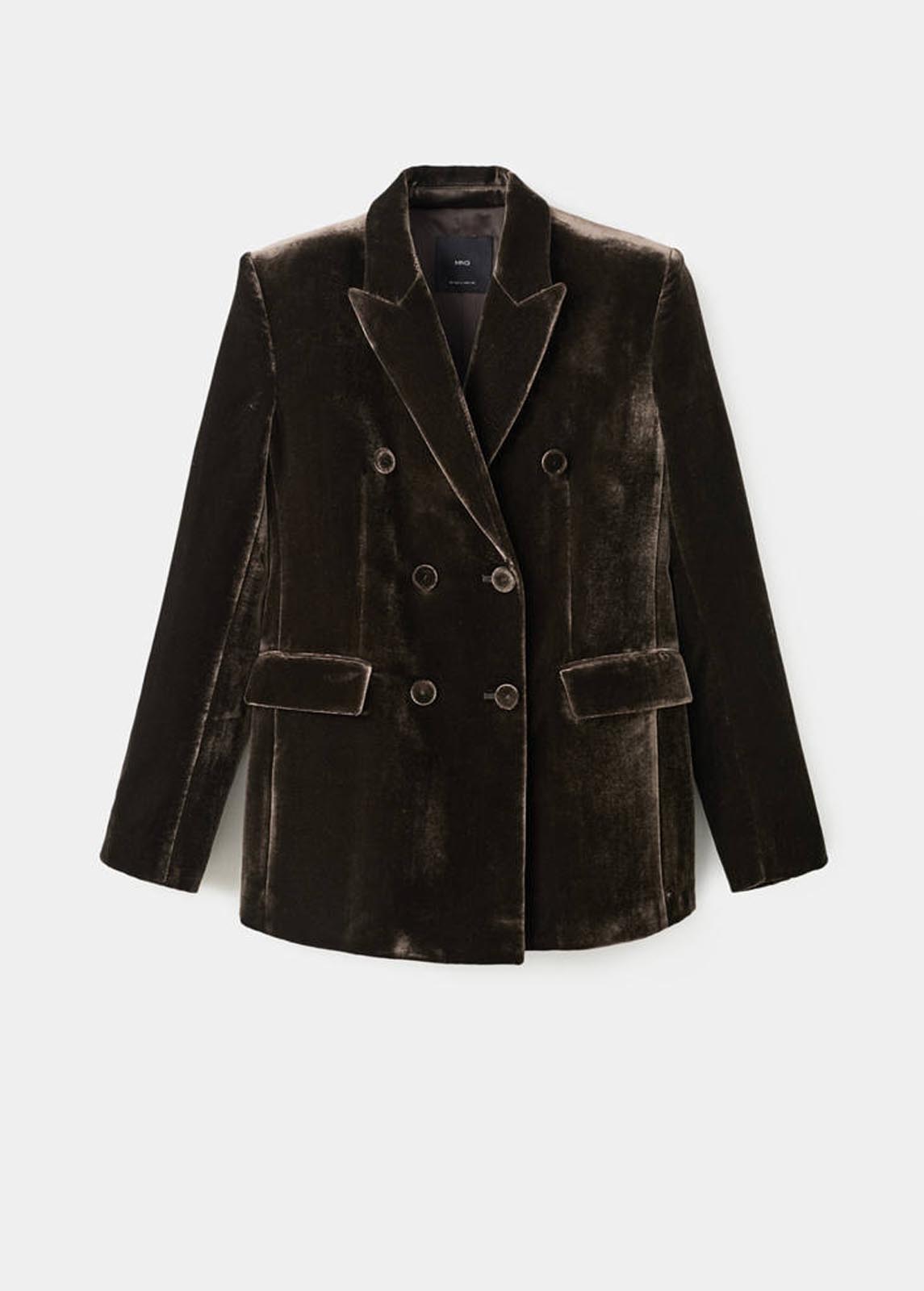 Cuello pico con solapa,Cierre de doble botonadura,Esta prenda pertenece a nuestra colección de fiesta y evento, diseñada para elevar tus looks en ocasiones especiales,Solapas con muesca,Total look,Manga larga con puños abotonados,Diseño recto,Forro interior,Tejido de terciopelo,Dos bolsillos de solapa en la parte frontal