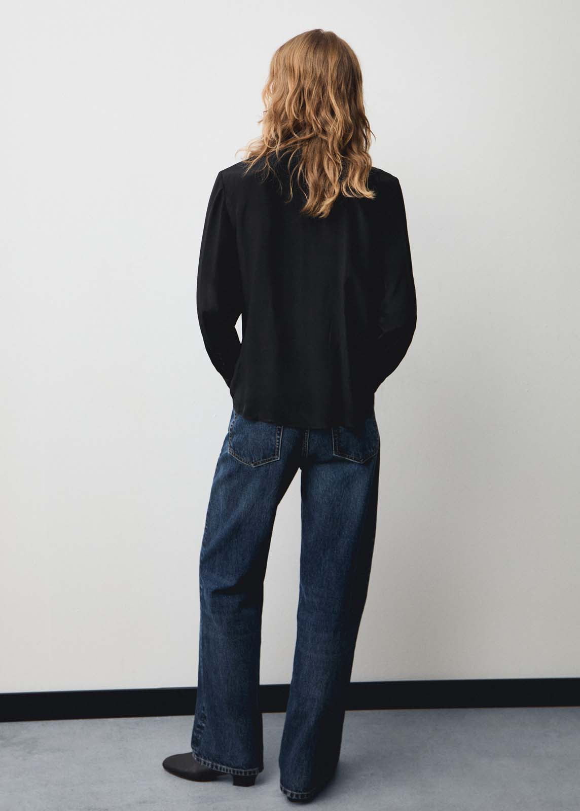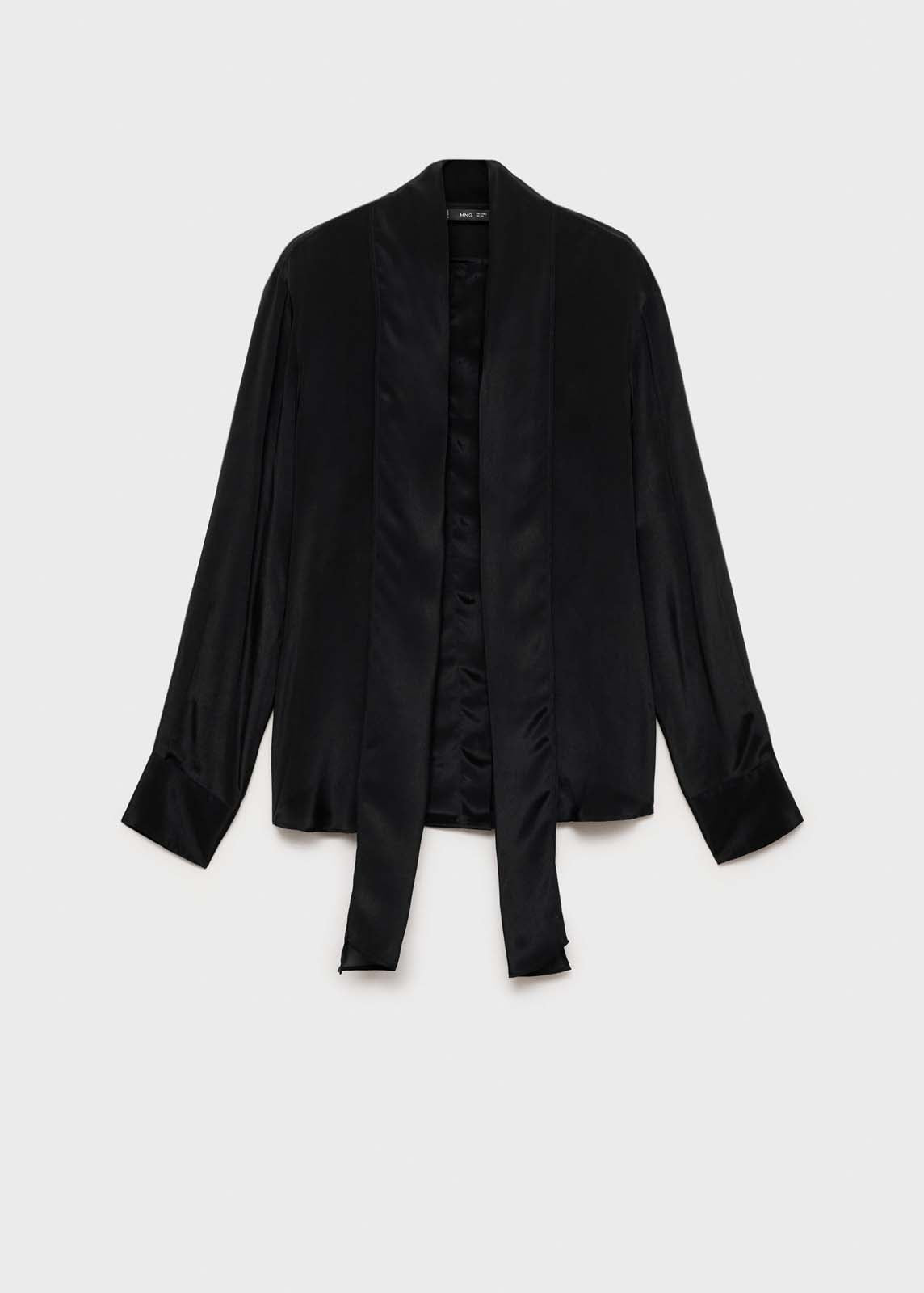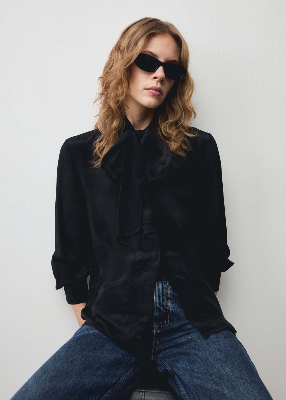 Cierre oculto de botones,Tejido fluido,Lazada al cuello,Tejido satinado,Diseño recto,Cuello camisero,La modelo mide 1,79 y lleva una talla S/36,Manga larga abotonada