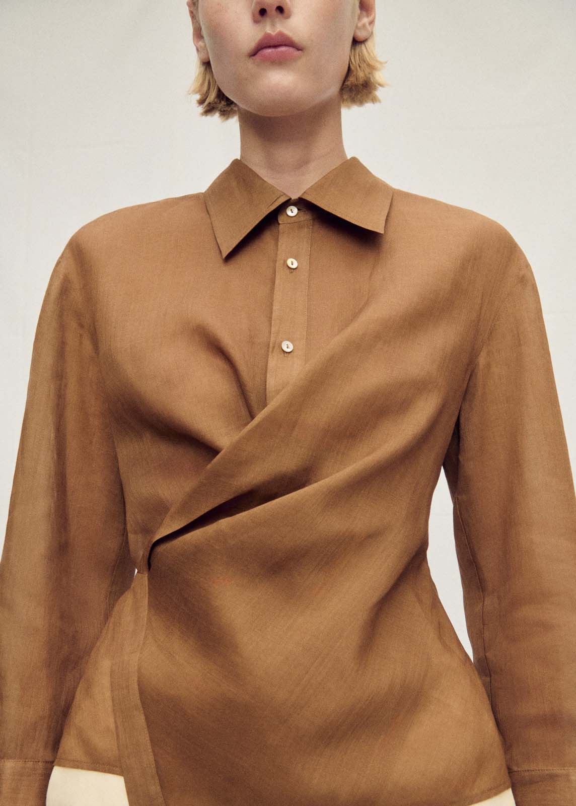 Tejido 100% ramio,Cierre delantero con tres botones,Bajo asimétrico,Colección Selection,Regular fit,Manga larga con puños abotonados,Diseño recto,Cuello camisero