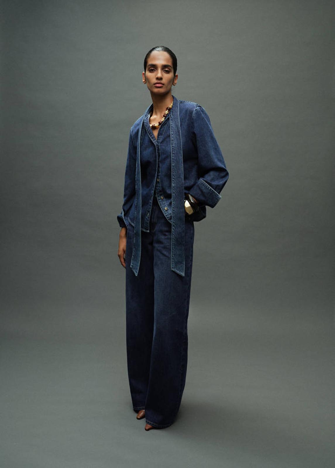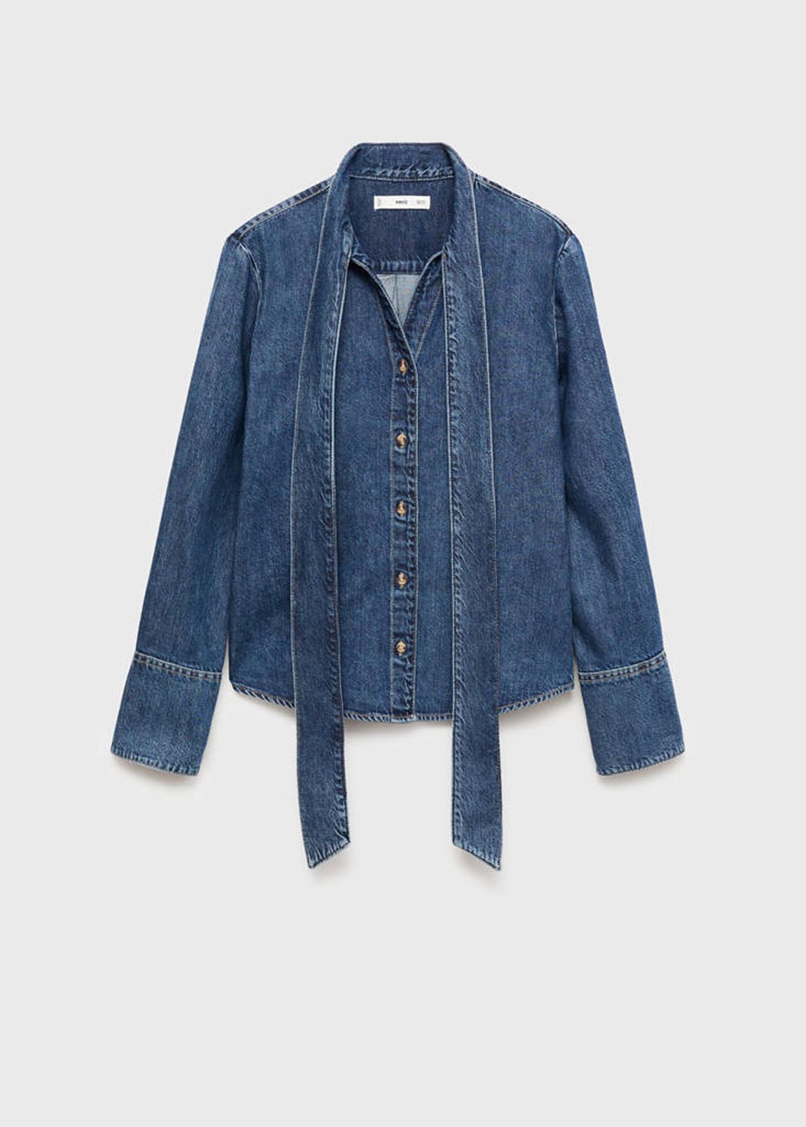 Lazo en el cuello,Diseño recto,Cuello camisero,Tejido de algodón estilo tejano vaquero,Cierre delantero con botones,Manga larga