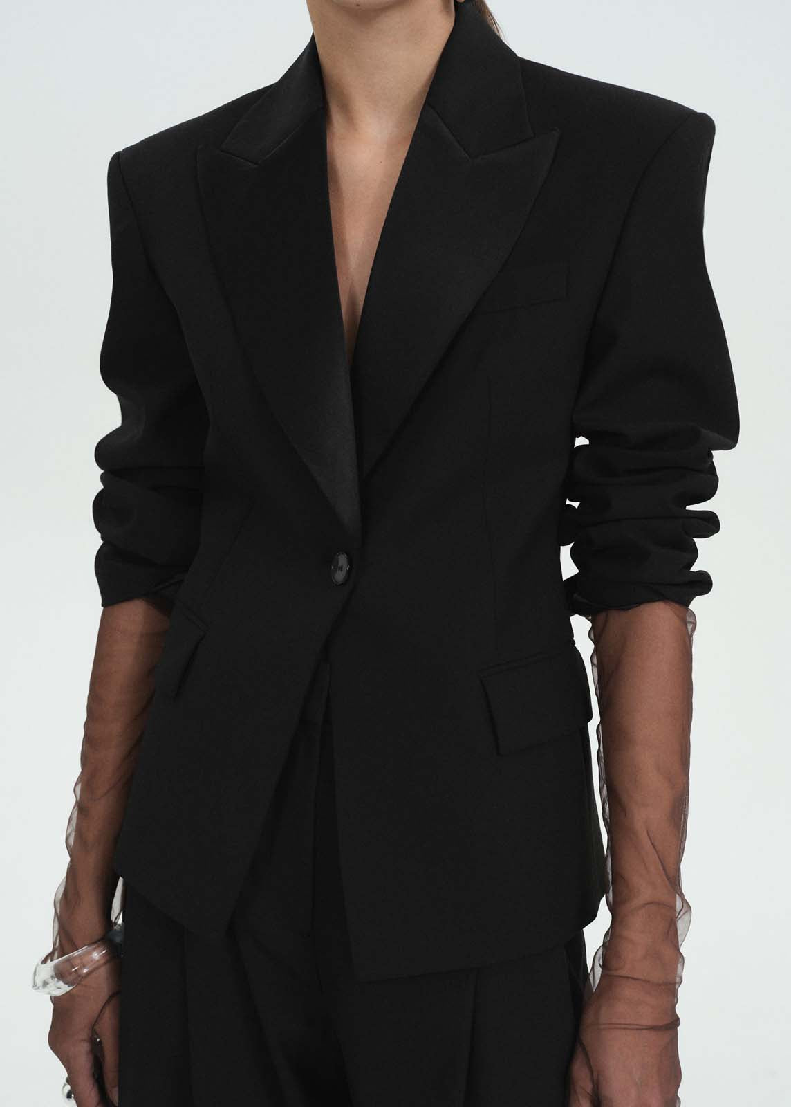 Forro interior,Solapas satinadas,Colección fiesta y ceremonia,Cuello pico con solapa,Tejido mezcla de lana,Cierre de botón en la parte delantera,Total look,Bolsillo de ribete en la parte delantera,Dos bolsillos delantero de ribete y solapa,La modelo mide 1,77 y lleva una talla S/36,Colección Selection,Manga larga