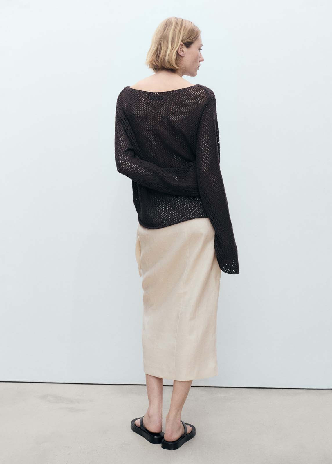 Detalle de nudo en la cintura,Tiro medio,Cierre delantero,Tejido 100% de lino,Disponible Plus,Diseño recto,Diseño midi