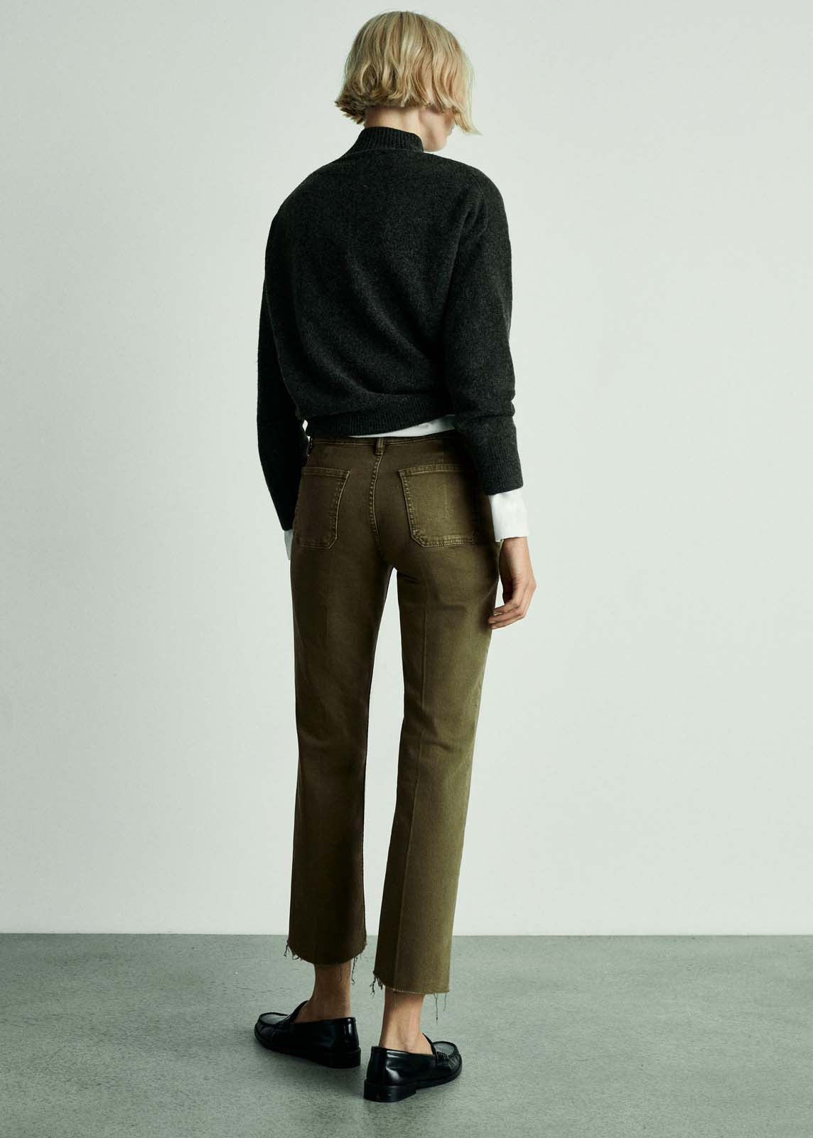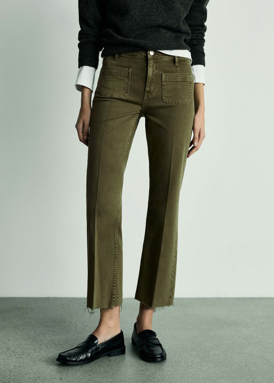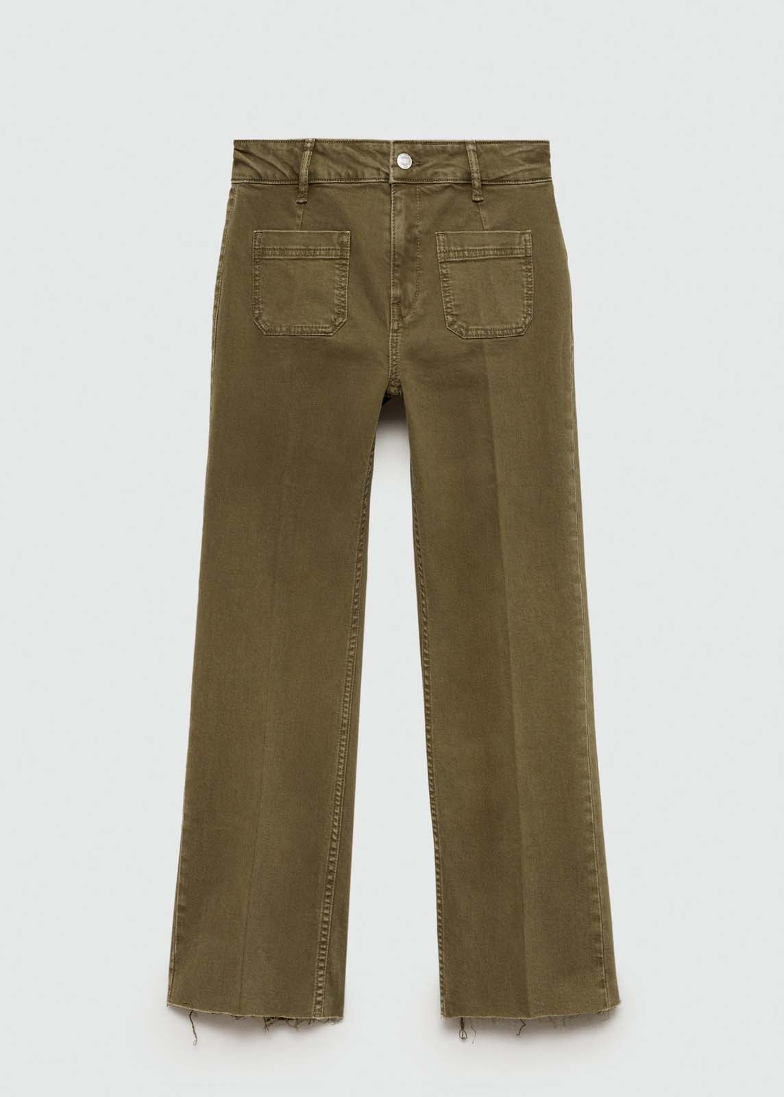 Trabillas,Tiro medio,Dos bolsillos de parche en la parte delantera,Dos bolsillos de parche en la parte posterior,Diseño acampanado,Tejido de algodón estilo tejano vaquero,Diseño largo,Cierre delantero de cremallera y botón
