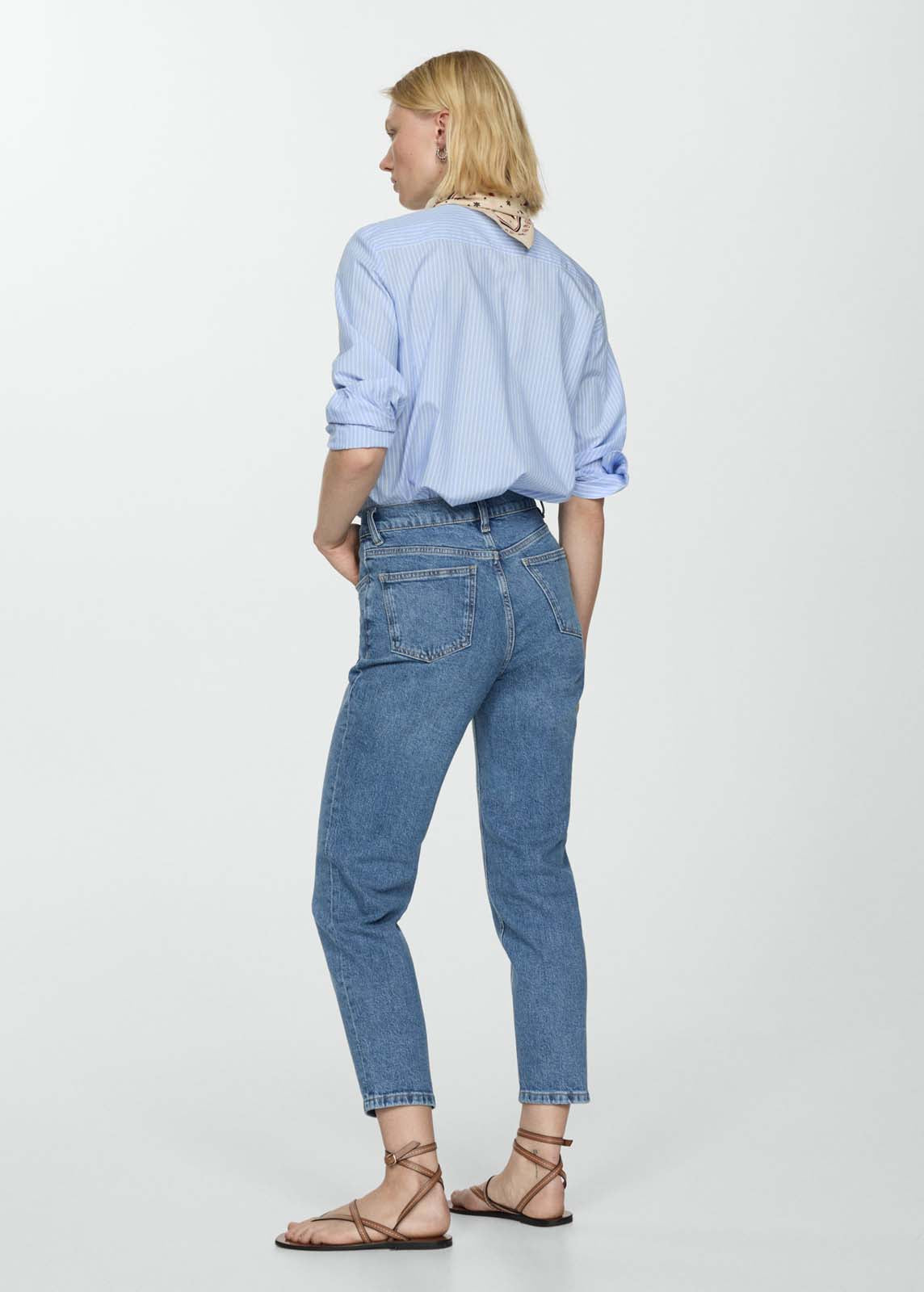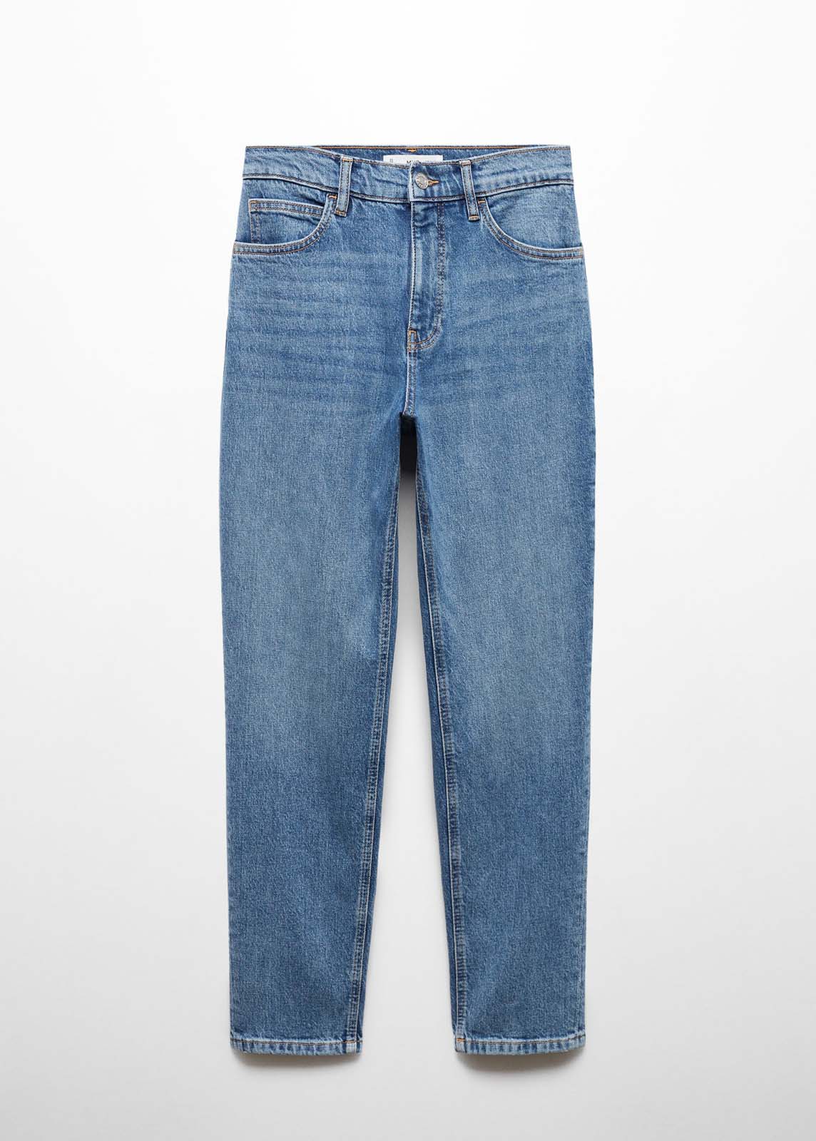 Tejido de algodón estilo tejano vaquero,Tejido elástico,Trabillas,Cinco bolsillos,Cierre de cremallera y botón,Tiro alto,Mom-fit,Disponible Plus,Largo interior 70 cm,La modelo mide 181 y lleva una talla 36