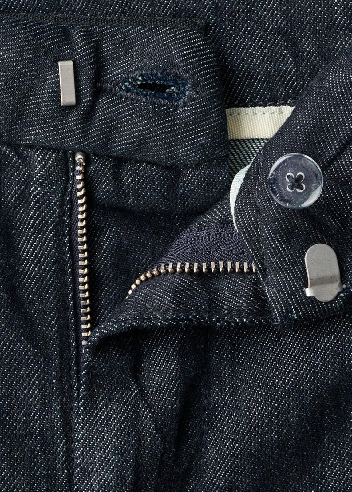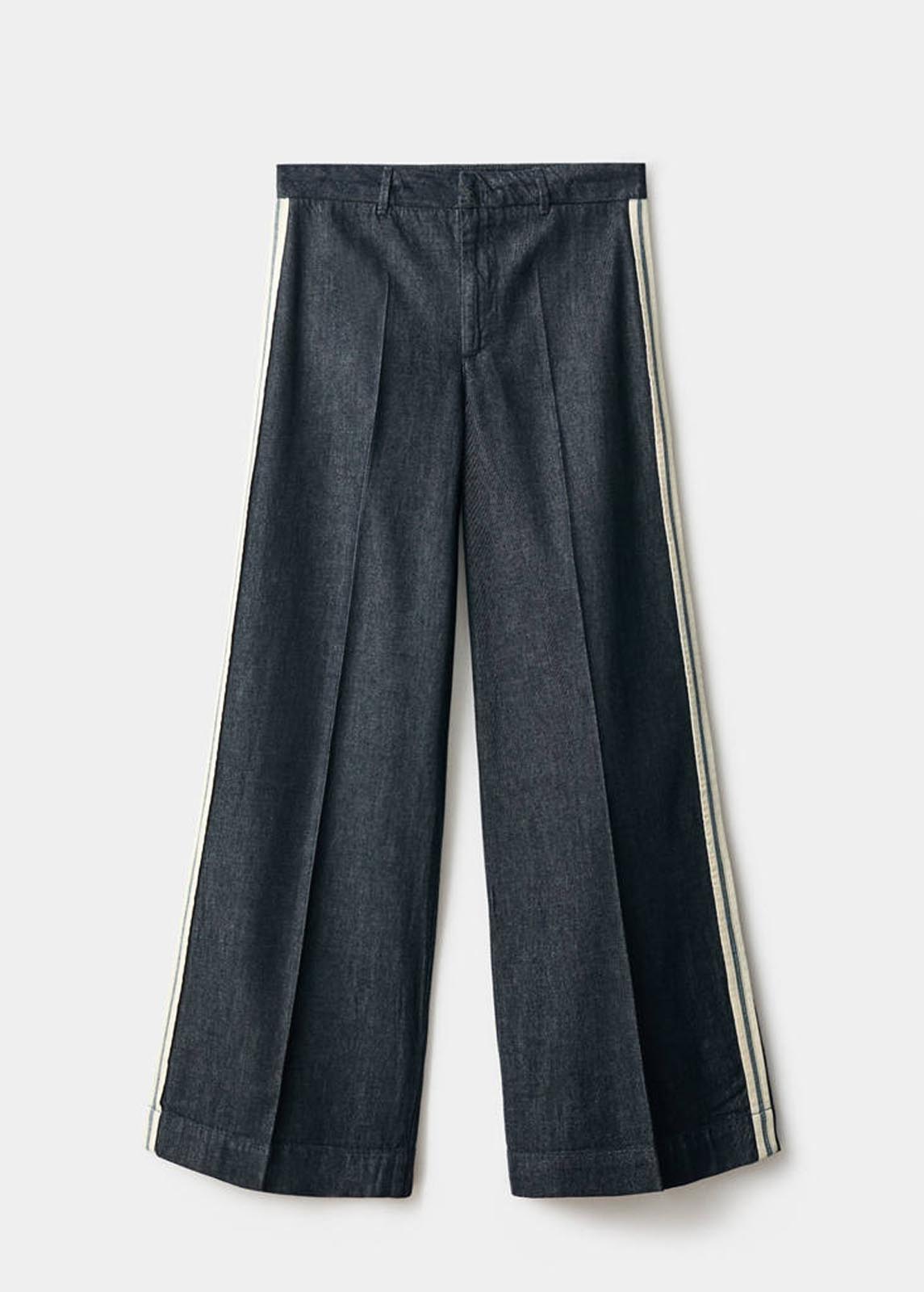 Tejido de algodón estilo tejano vaquero. Diseño largo. Diseño wide leg. Tiro bajo. Trabillas. Rayas laterales. Cierre oculto de botón, gancho y cremallera. Largo interior 81,7 cm