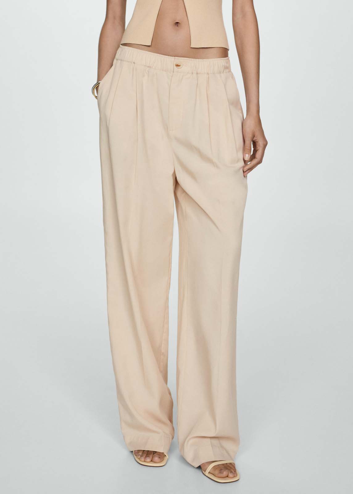 Cierre de cremallera y botón,Diseño wideleg,Detalle de pliegues,Cintura con goma elástica,Dos bolsillos laterales,Diseño largo,Tejido mezcla de lyocell, algodón y lino