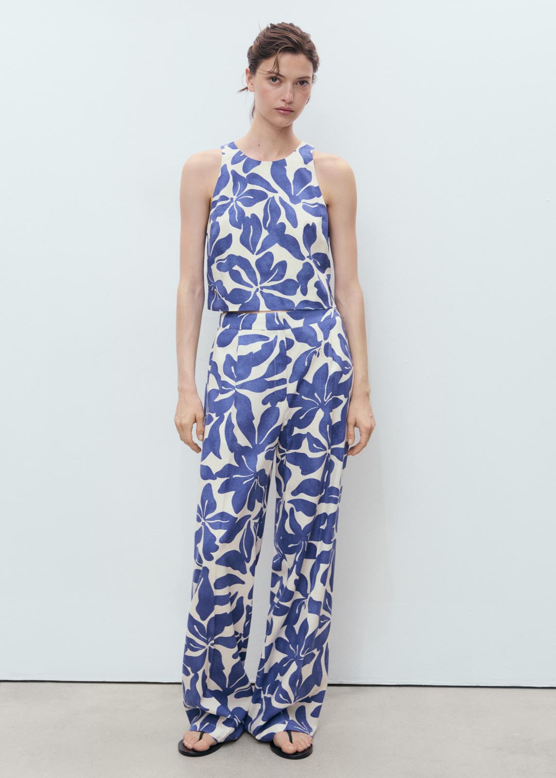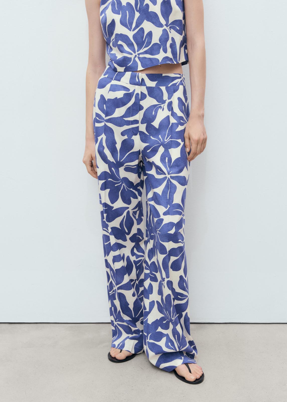 Tiro medio,Detalle de pinzas,Dos bolsillos laterales,Cierre oculto de botón, gancho y cremallera,Total look,Diseño recto,Estampado floral,Diseño largo
