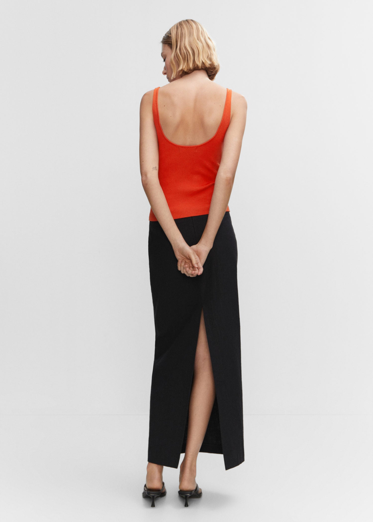 Top punto escote pico- Tejido de punto fino,Cuello pico,Diseño largo,Espalda abierta,Tirantes finos,Diseño entallado,Disponible Plus,Looks de oficina- No usar lejia, Plancha max 110°c, No limpiar en seco, No se puede usar secadora, Lavar a mano max 30°c- COMPOSICIÓN: 72% VISCOSA, 28% POLIAMIDA - 390mm-