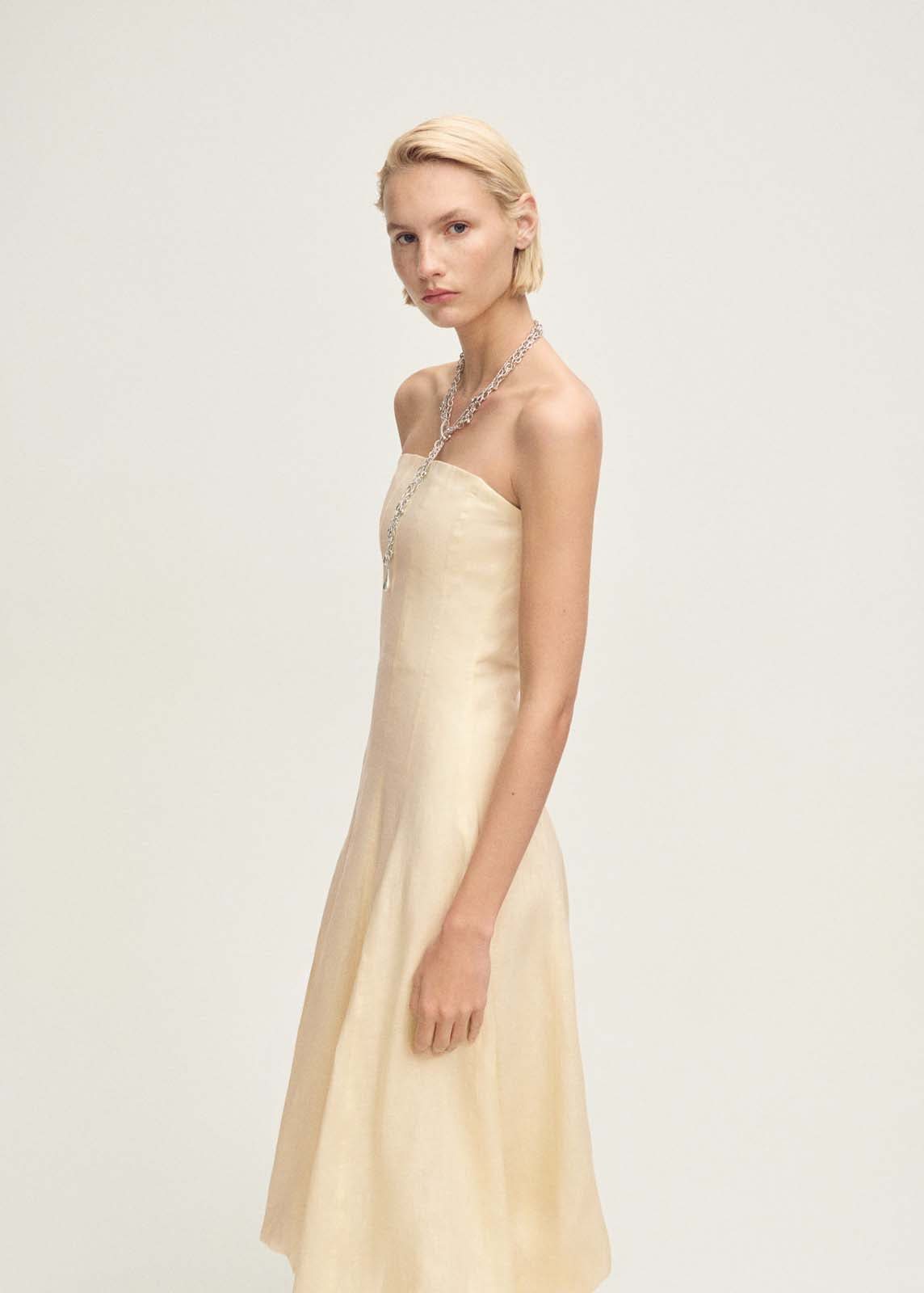 Bajo abullonado,Colección Selection,Tejido 100% de lino,Diseño evasé,Palabra de honor,Cierre de cremallera en la parte posterior,Diseño midi,Sin mangas