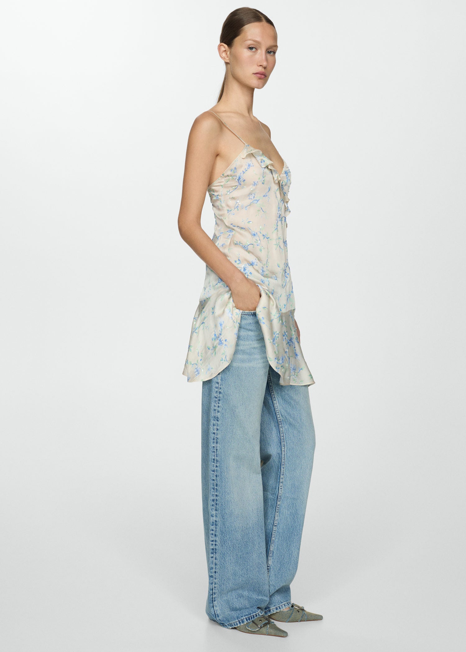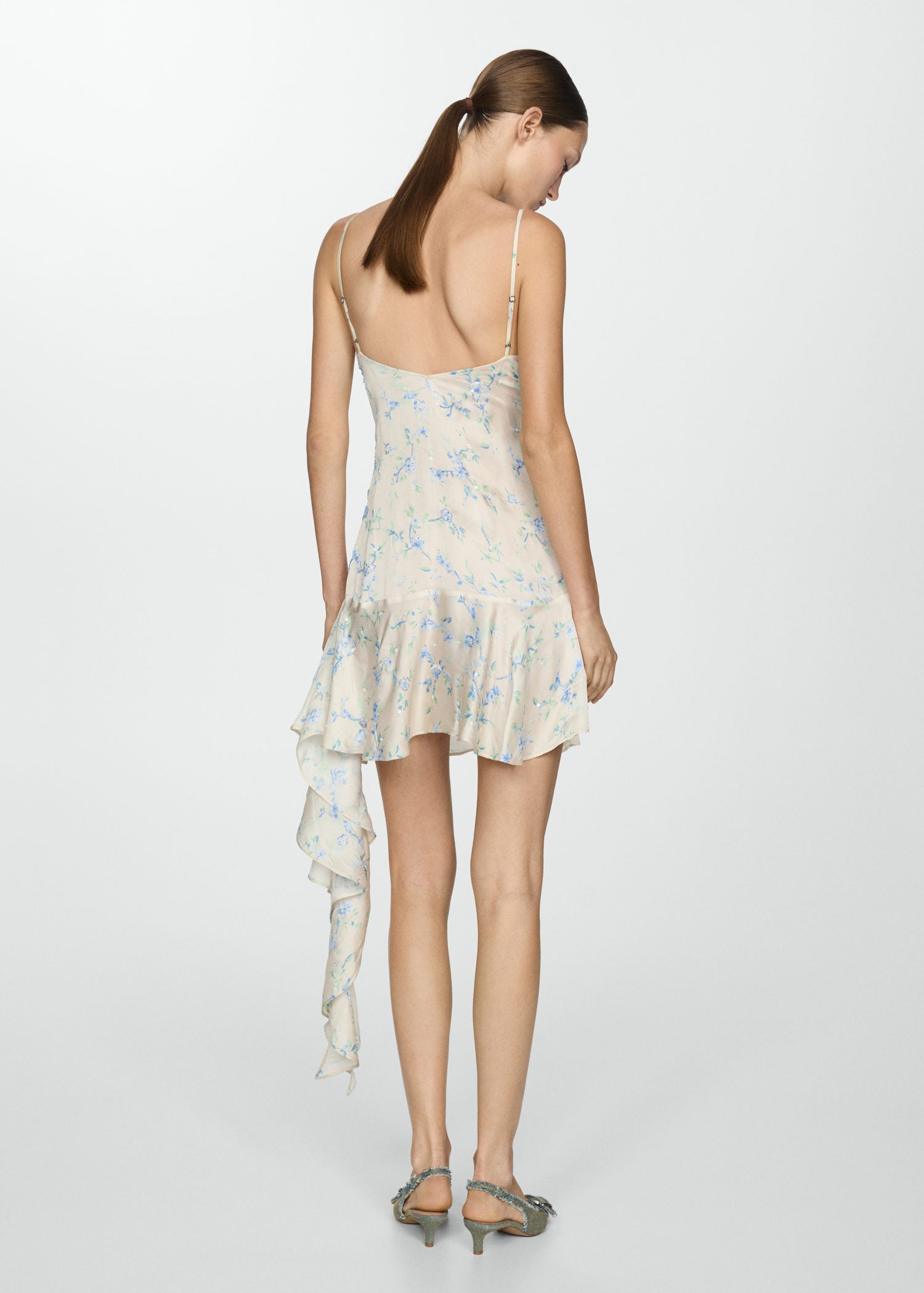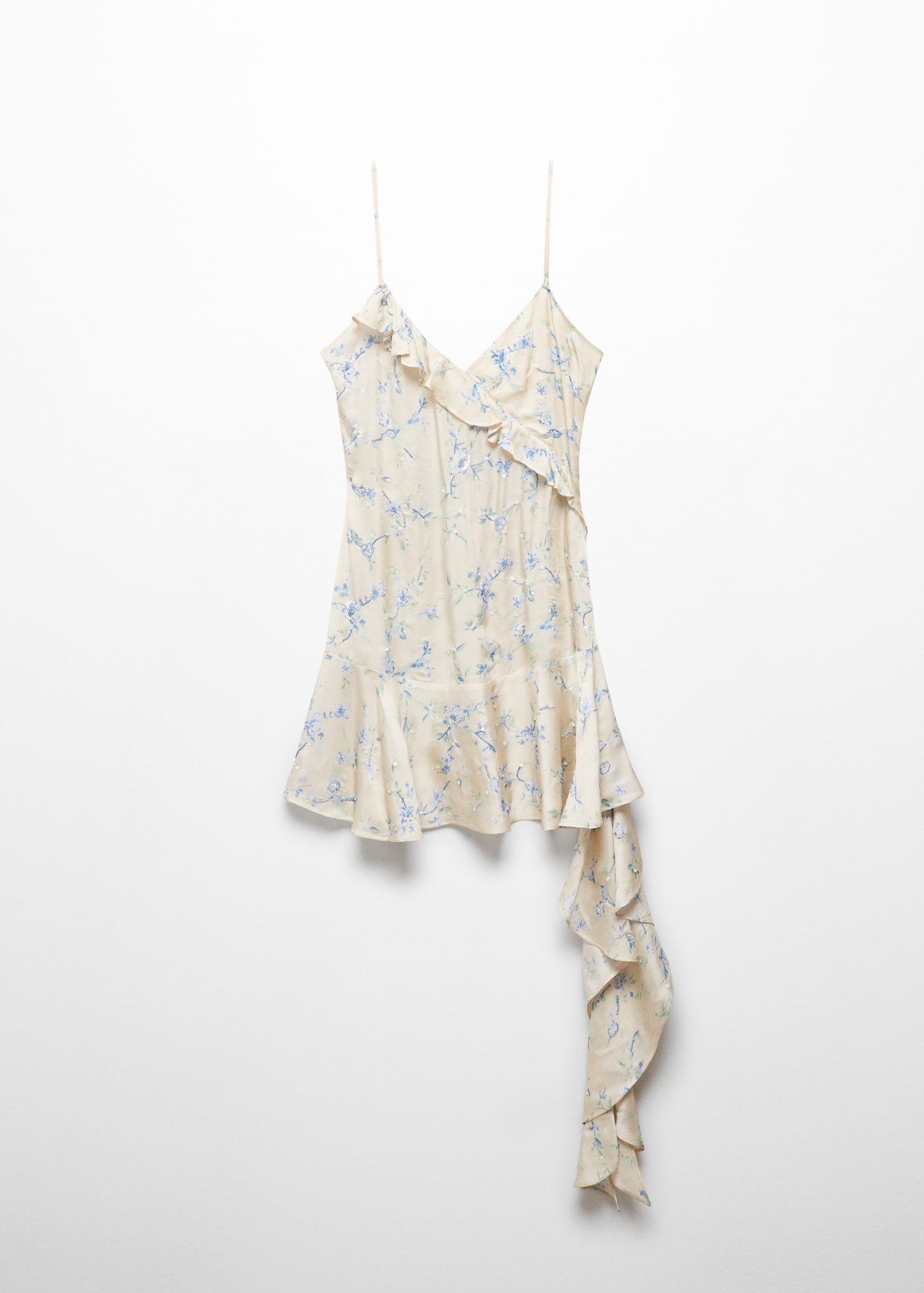 Estampado floral,Cuello pico,Tejido fluido,Detalle de abalorios,Tirantes finos,Detalle de lentejuelas,Cierre lateral de cremallera,Diseño evasé,Bajo con vuelo,Detalle de volantes,Diseño corto,Colección fiesta y ceremonia,Espalda con escote