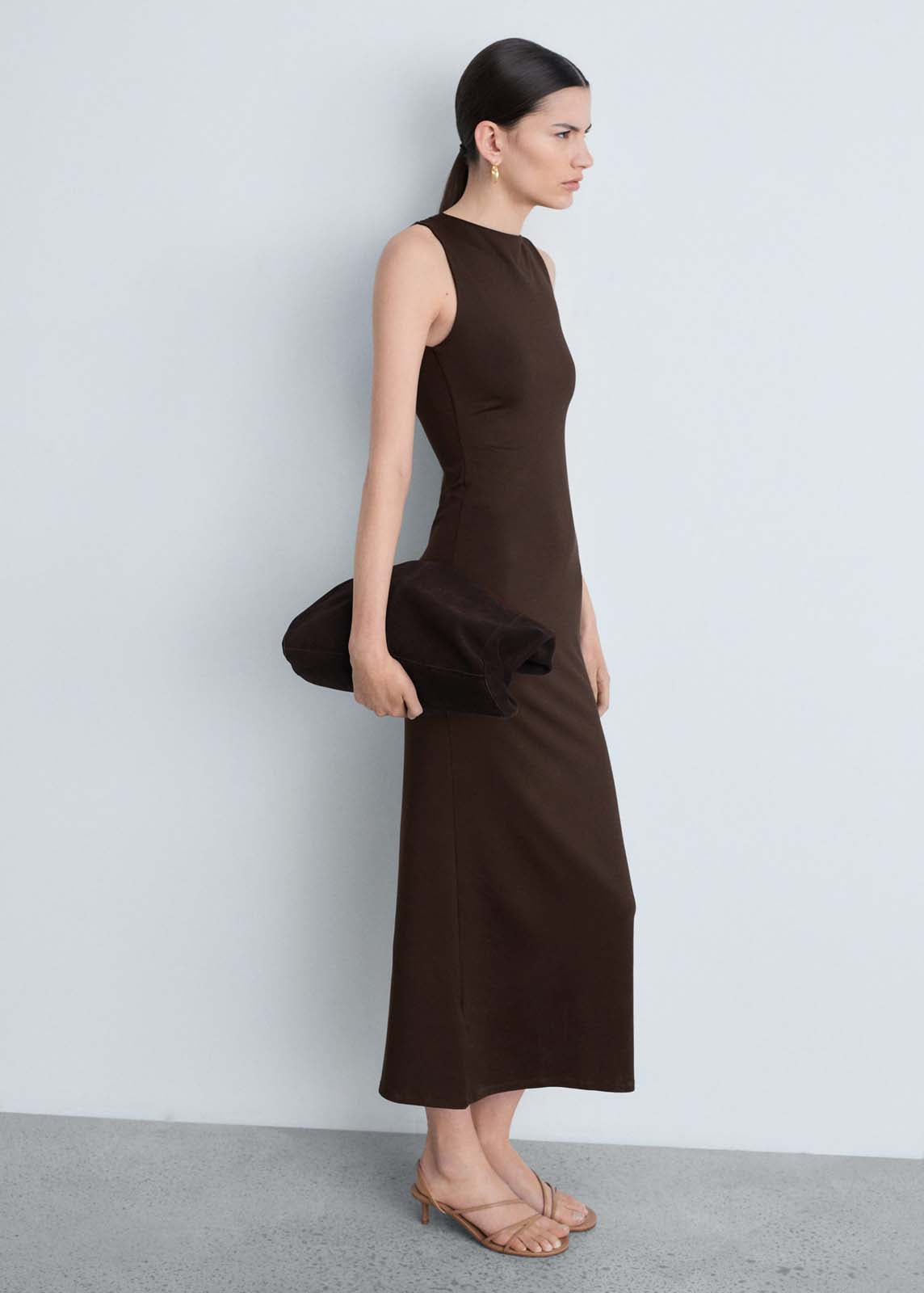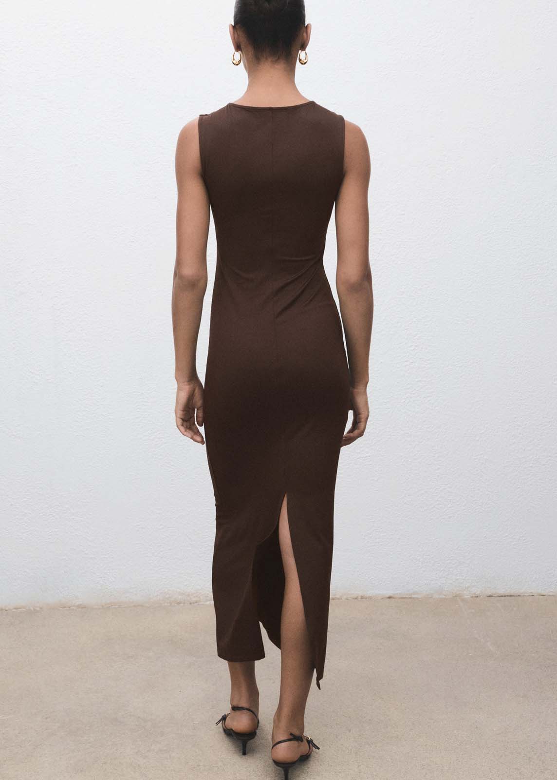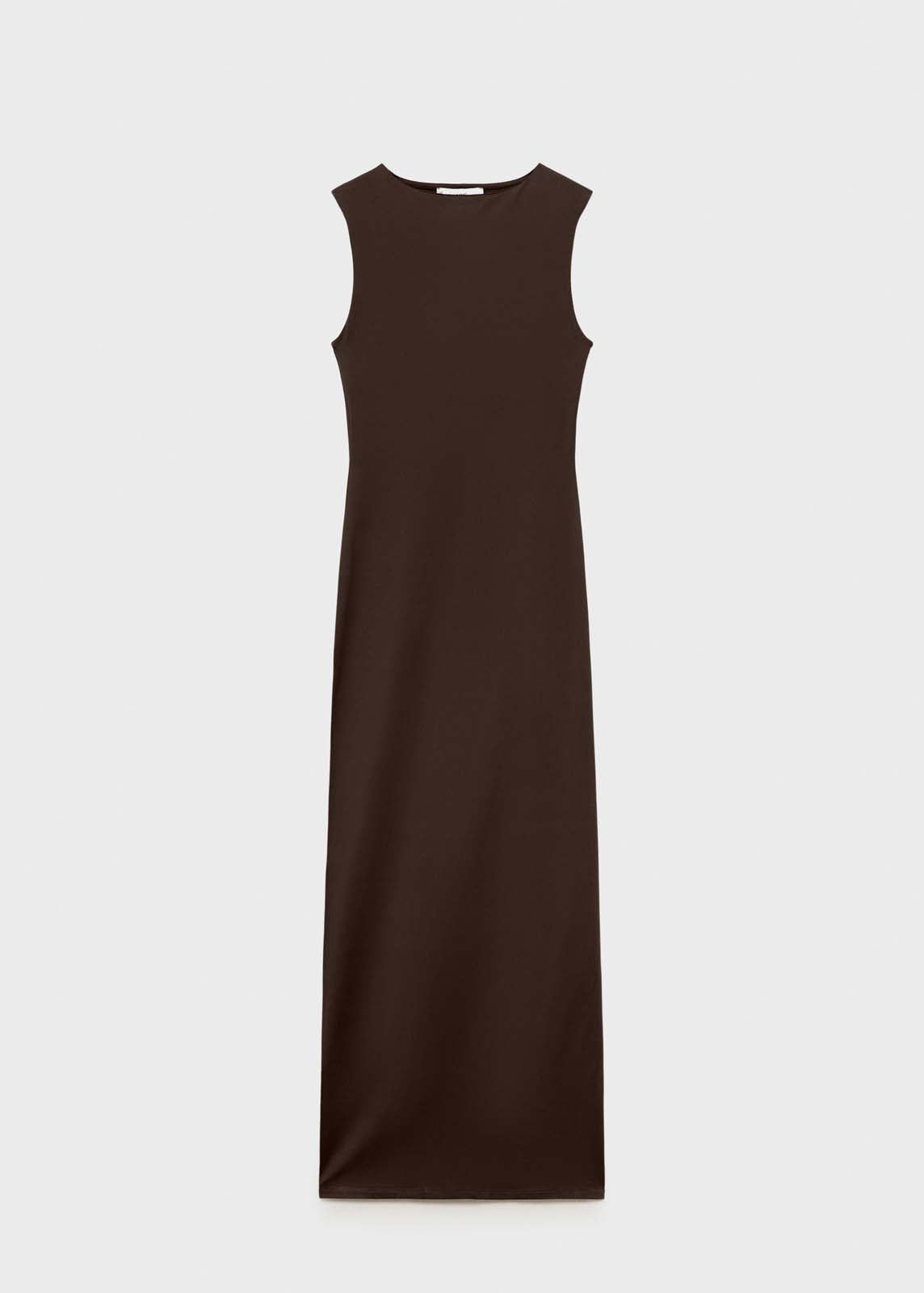 Detalle de abertura en la parte posterior,Tejido fluido,Sin cierre,Cuello redondo,Tirantes anchos,Diseño largo,Sin mangas,Diseño entallado