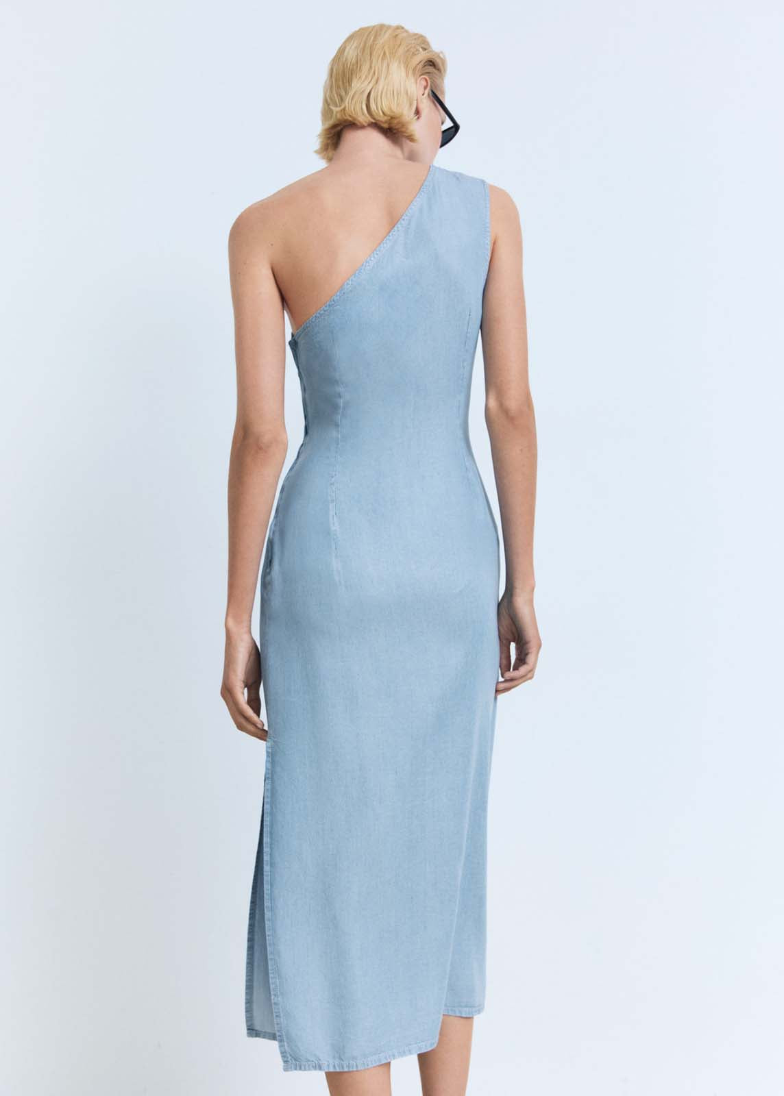 Manga corta,Detalle drapeado en la cintura,Tejido de lyocell,Cuello asimétrico,Diseño midi,Abertura lateral en el bajo,Diseño entallado,Cierre de cremallera lateral