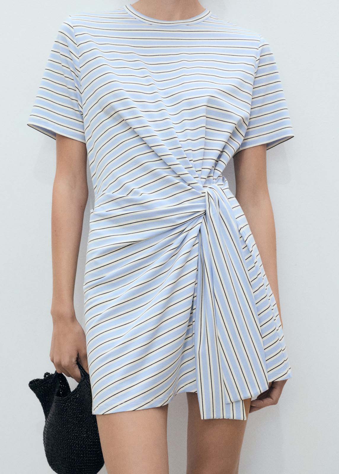 Manga corta,Detalle de nudo en la cintura,Estampado de rayas,Nudo ajustable,Sin cierre,Diseño corto,Cuello redondo,Diseño recto