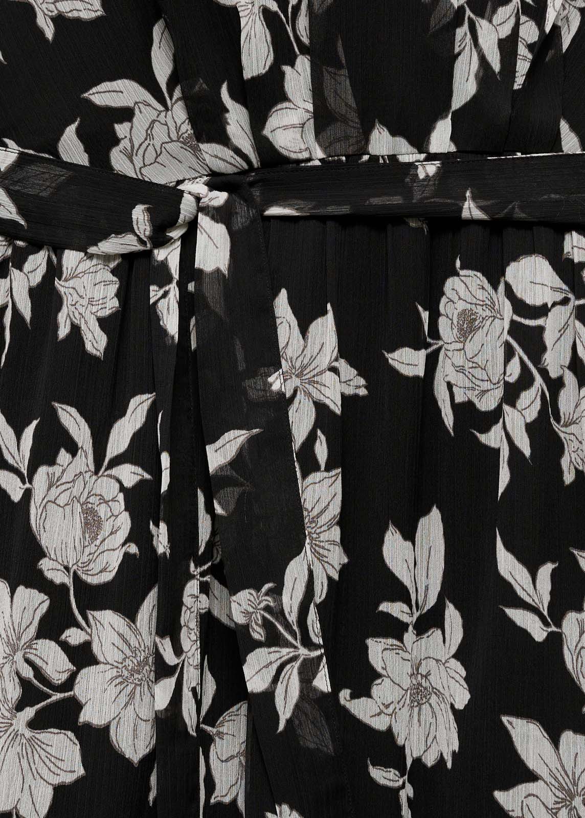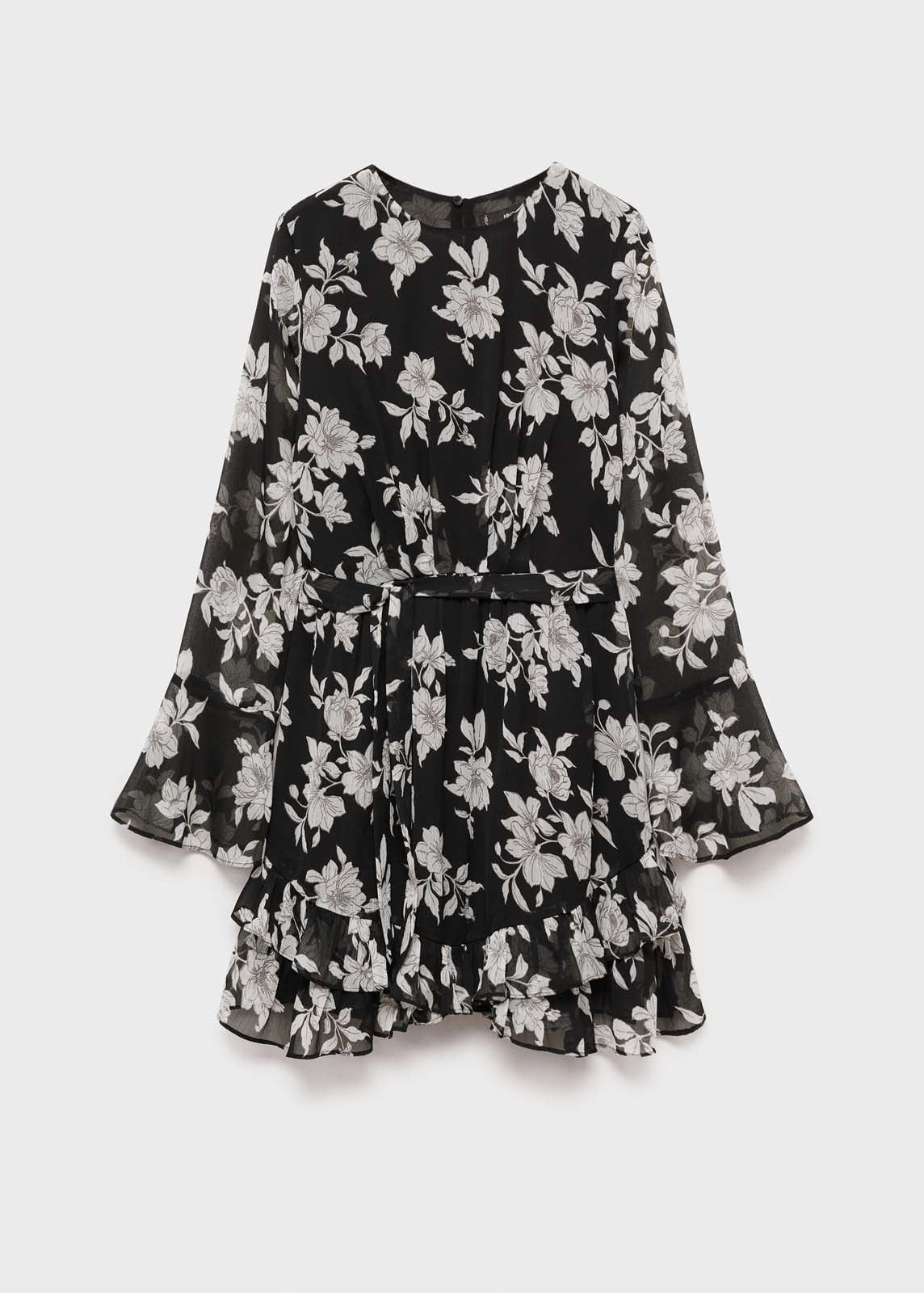 Cierre de botón en la parte posterior,Manga larga acampanada,Diseño corto,Cuello redondo,Diseño evasé,Lazo ajustable en la cintura,Estampado floral,Bajo con volante,Forro interior